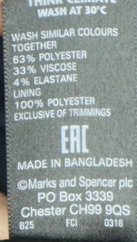 - Material Breakdown: 63% Polyester 33% Viscose 4% Elastane