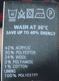 - Material Breakdown: 42% Acrylic 30% Polyester 24% Wool 3% Polyamide 1% Cotton