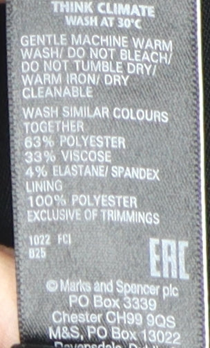 - Material Breakdown: 63% Polyester 33% Viscose 4% Elastane