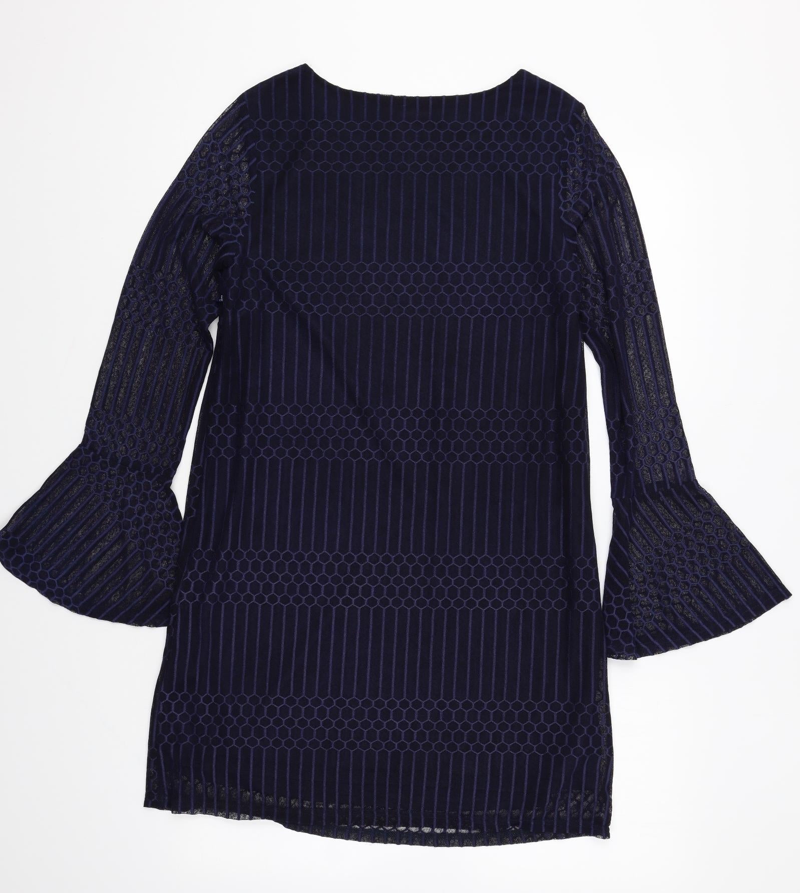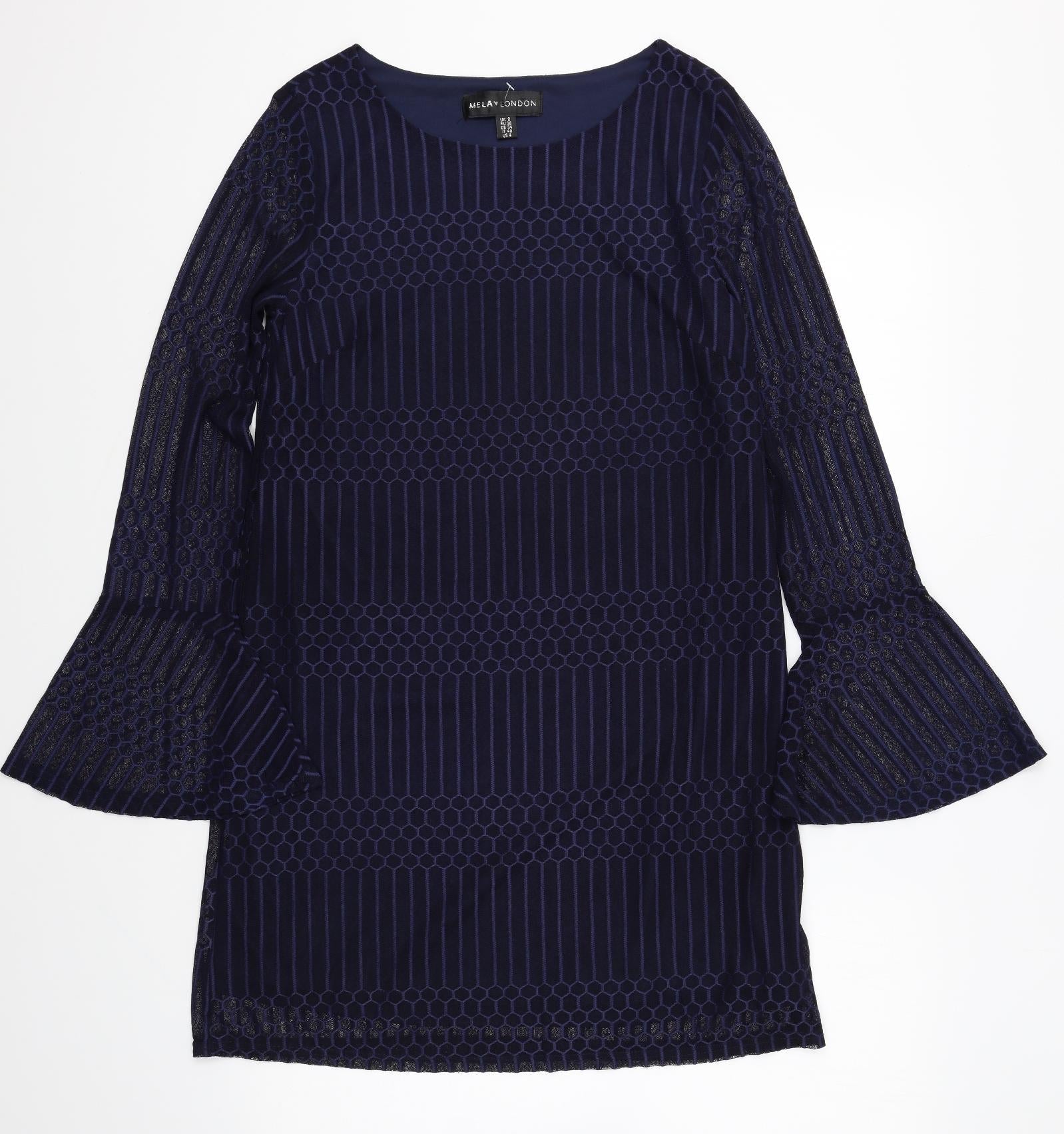 Mela London Womens Blue Geometric Polyester Shift Size 8 Boat Neck Pullover