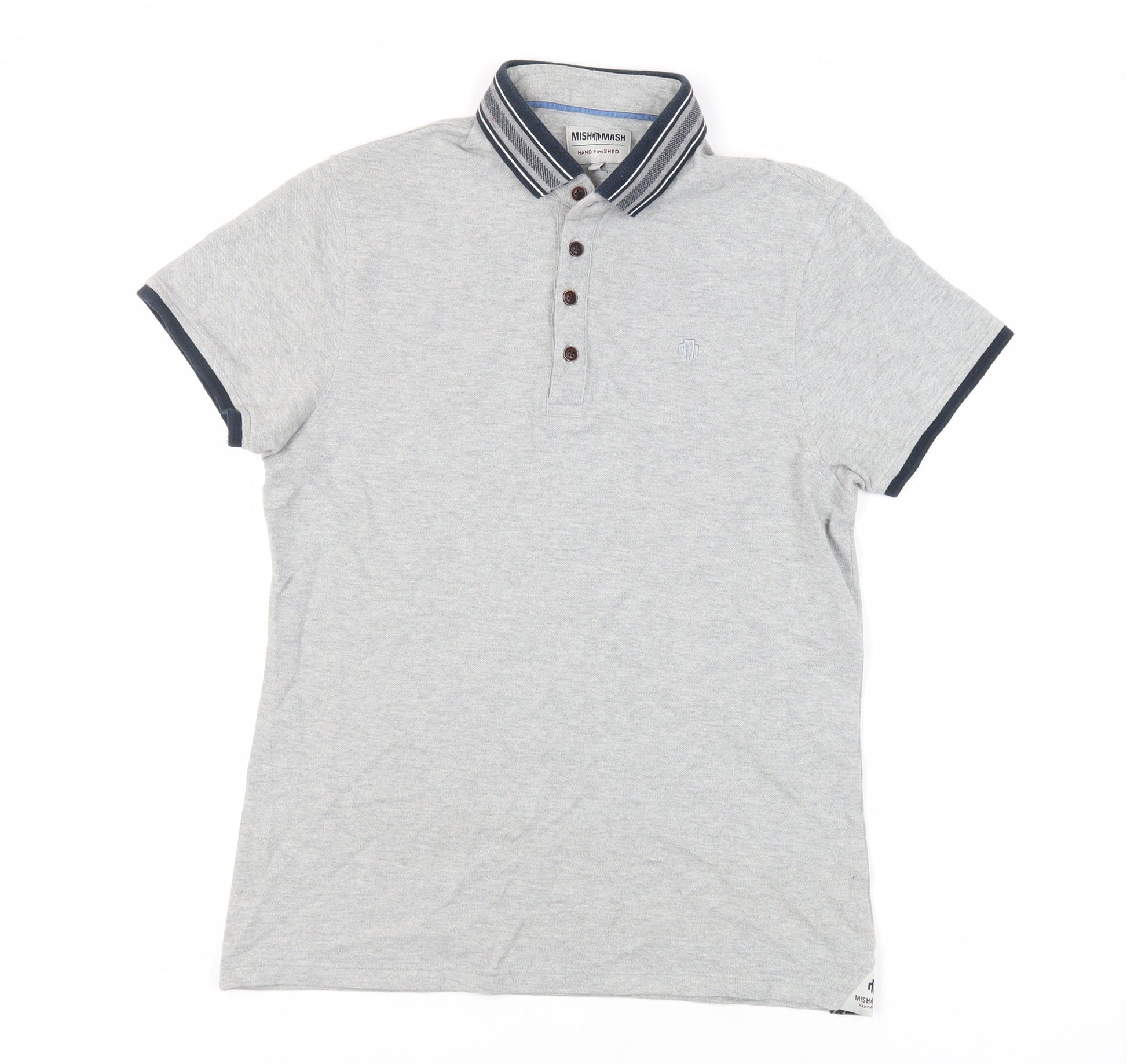 Mish Mash Mens Grey Cotton Polo Size M Collared Button - Logo