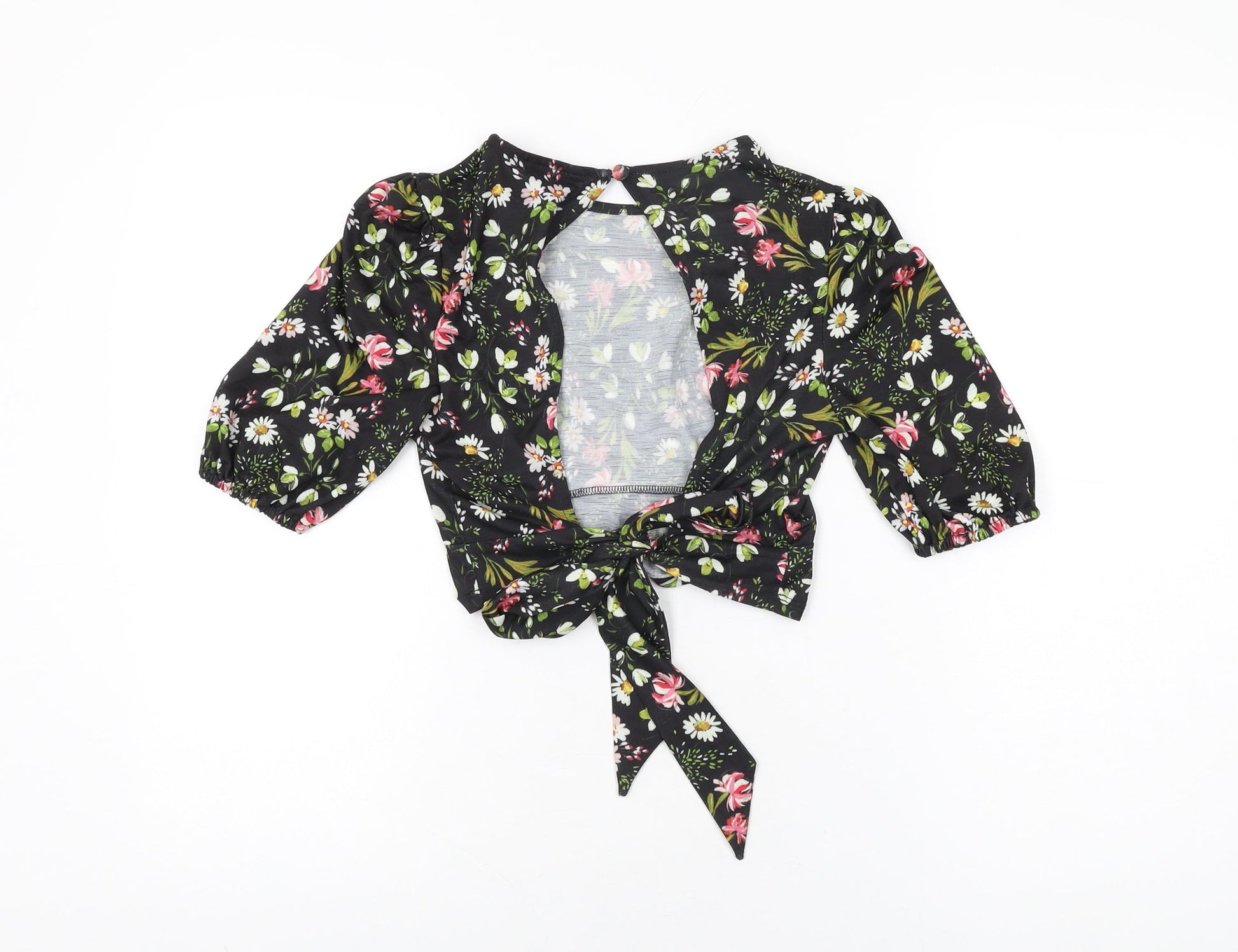 Miss Selfridge Womens Black Floral Polyester Cropped T-Shirt Size 6 Round Neck