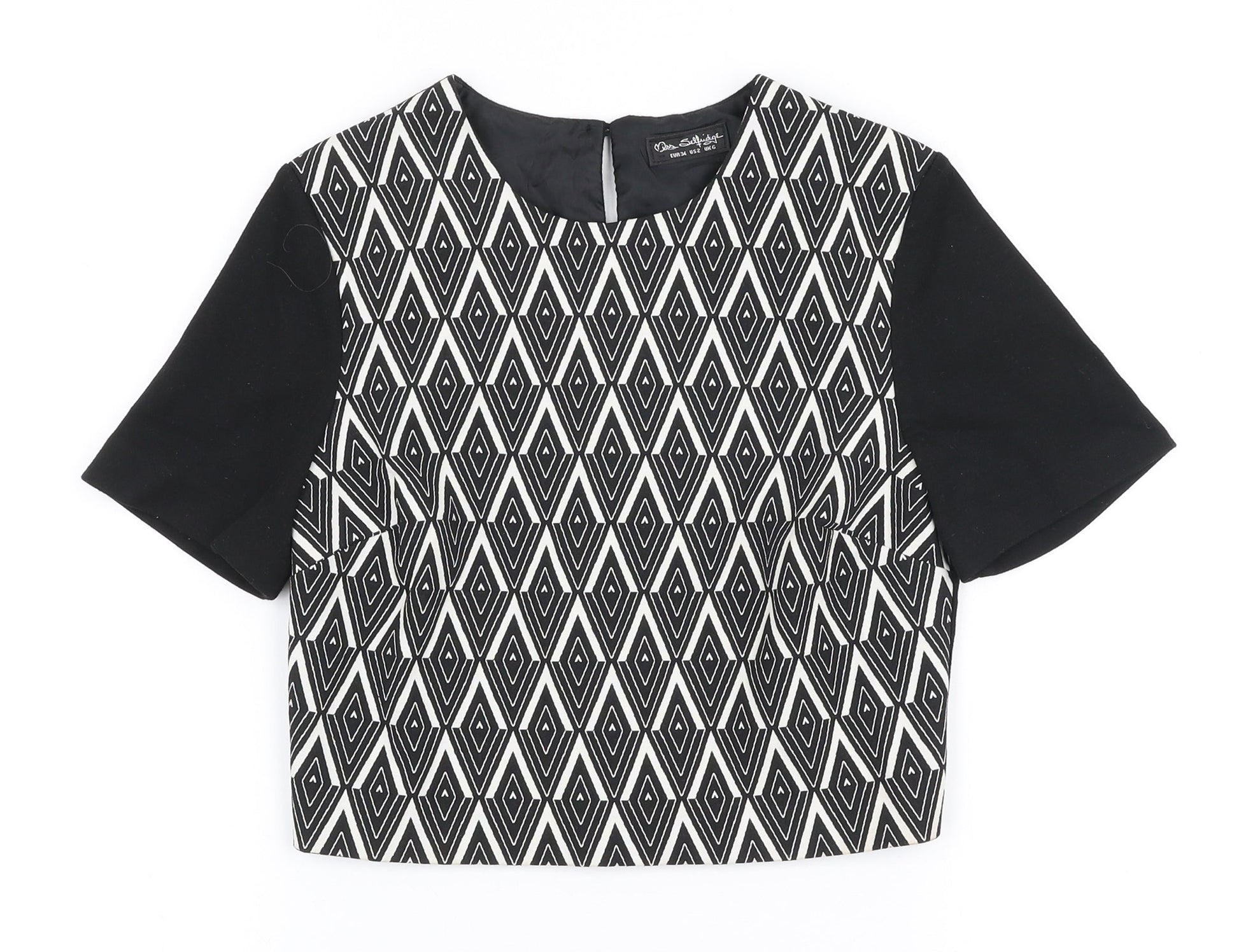 Miss Selfridge Womens Black Geometric Polyester Cropped Blouse Size 6 Round Neck