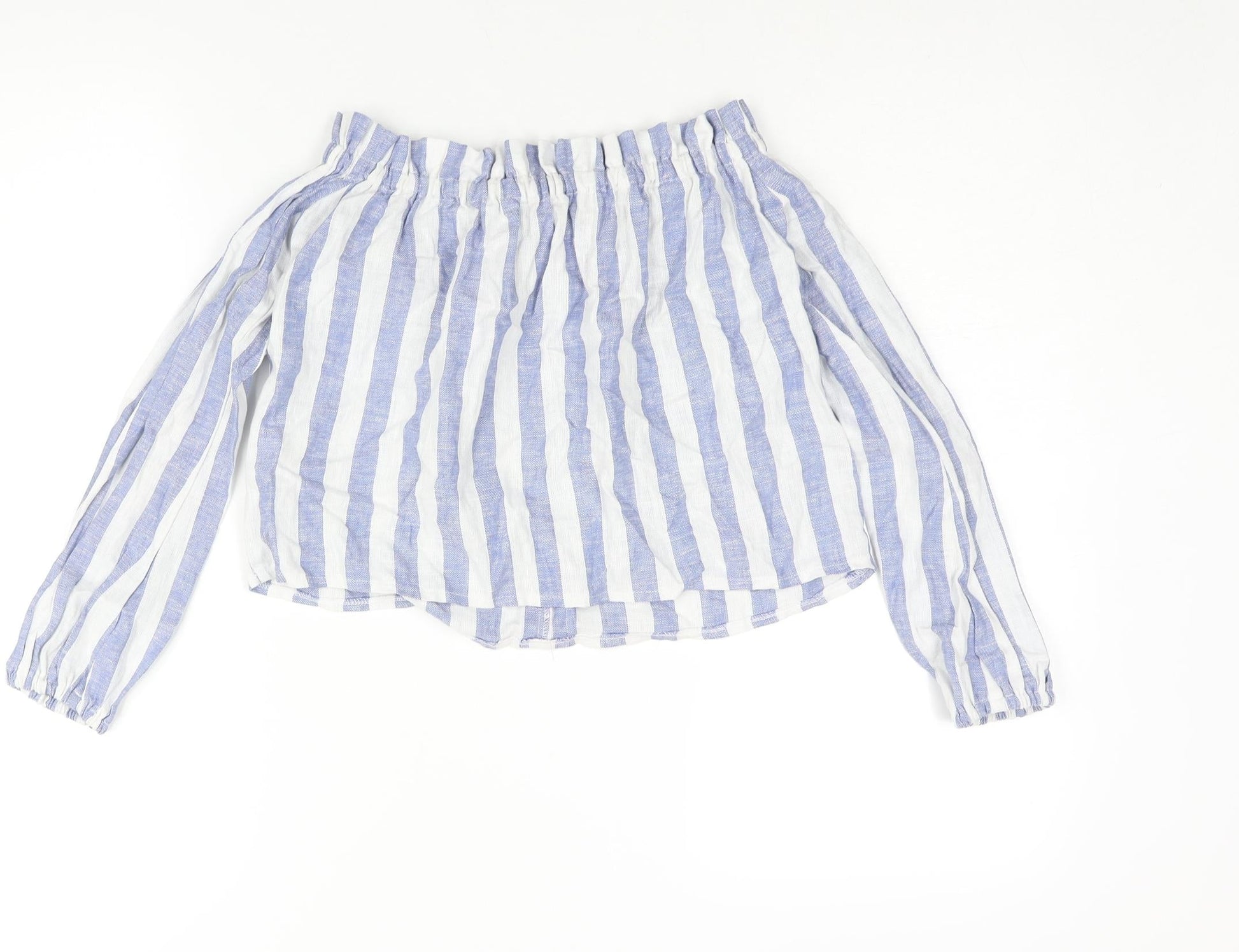 Miss Selfridge Womens Blue Striped Linen Basic Blouse Size 4 Off the Shoulder - Button Detail