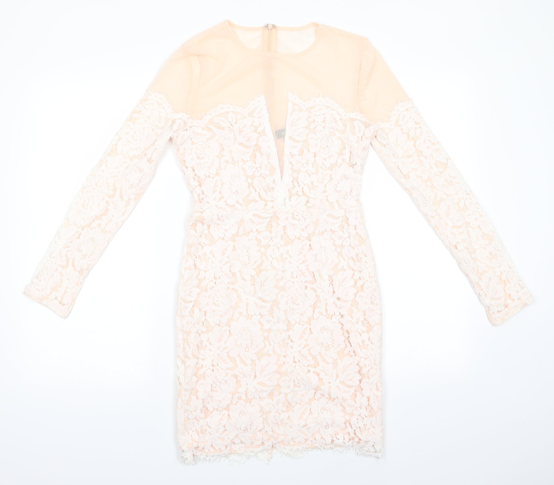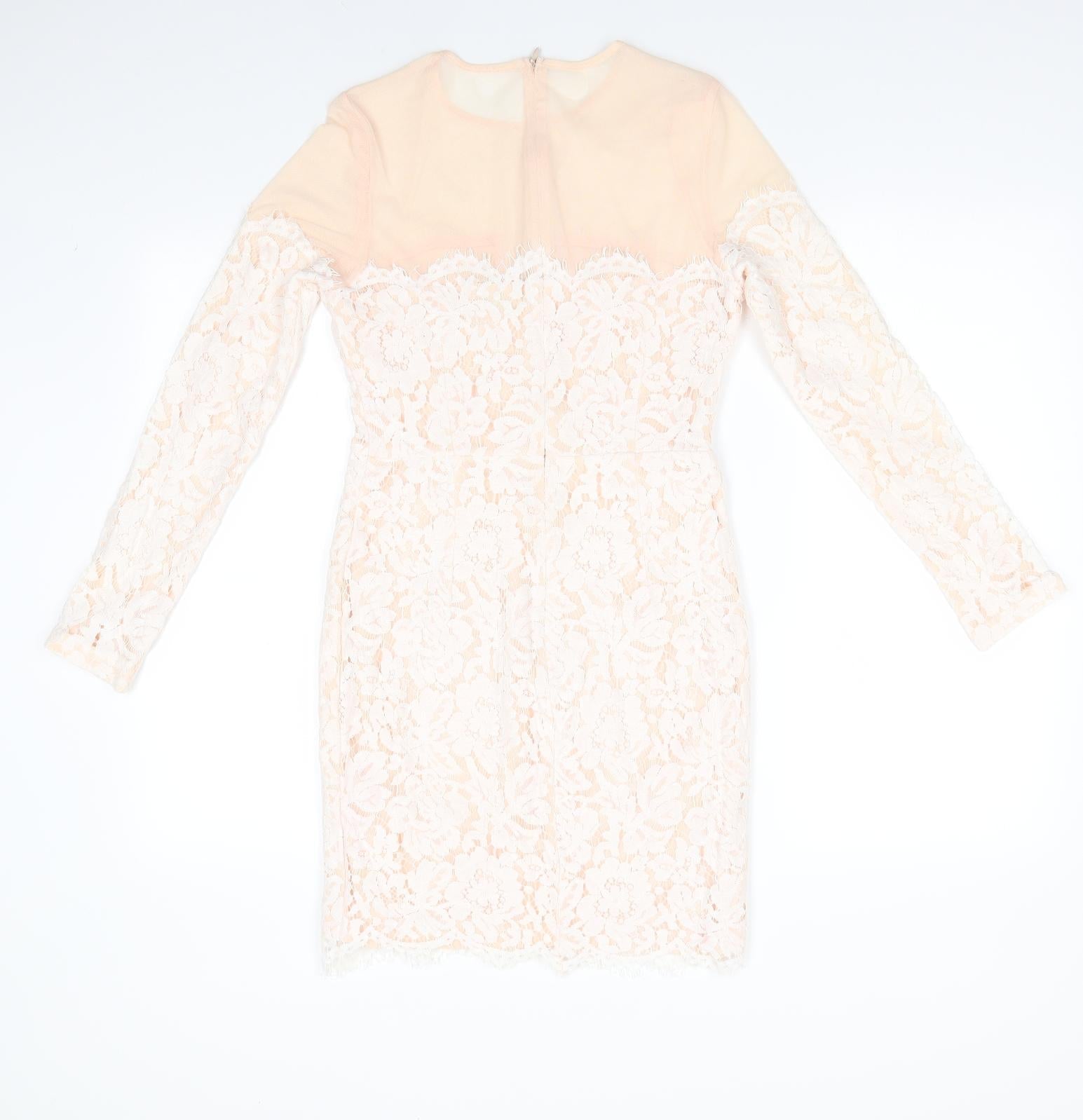 Missguided Womens Ivory Floral Polyester Bodycon Size 10 Round Neck Zip - Peach with Lace Overlay Dress Sheer Shoulders