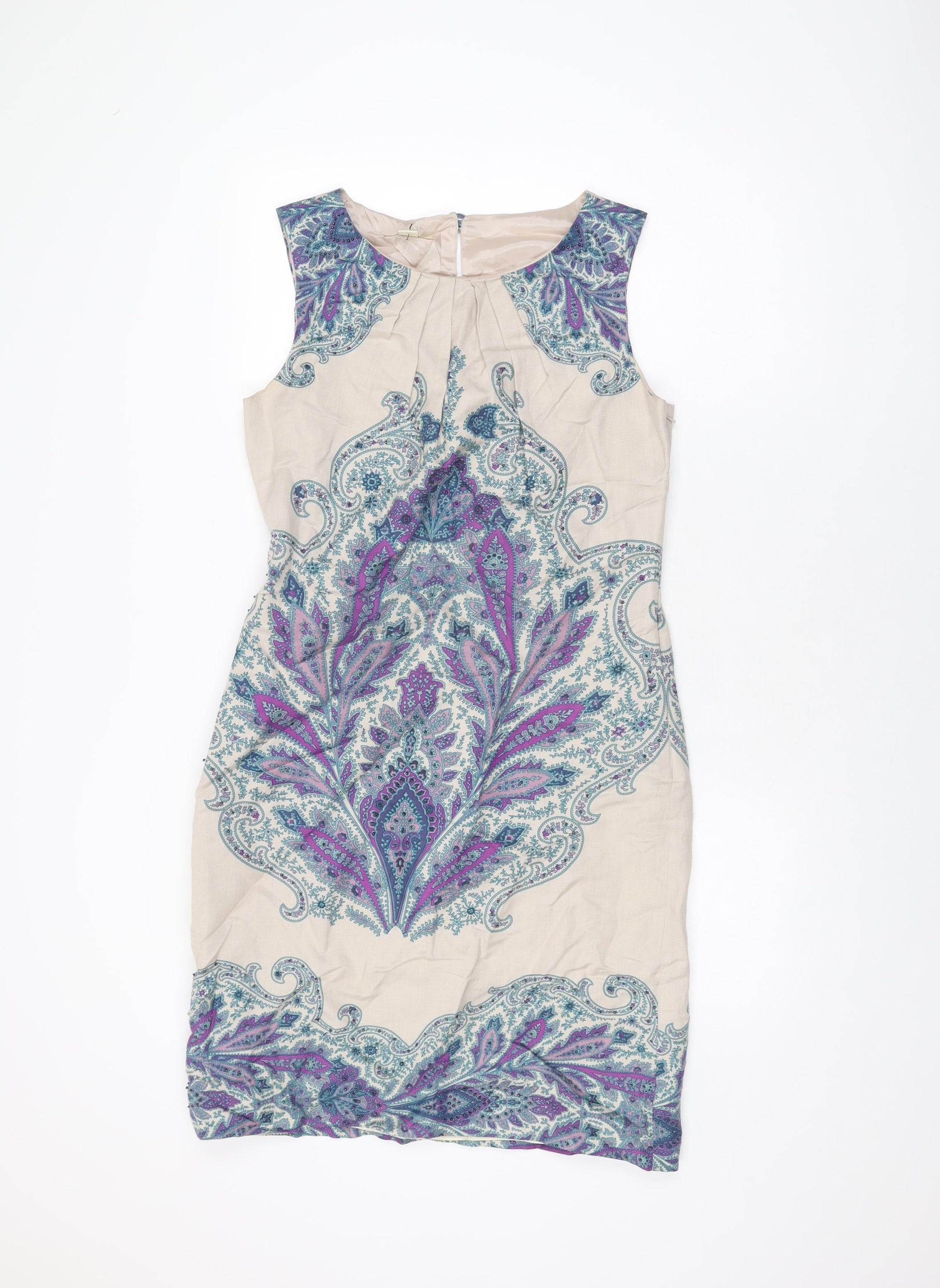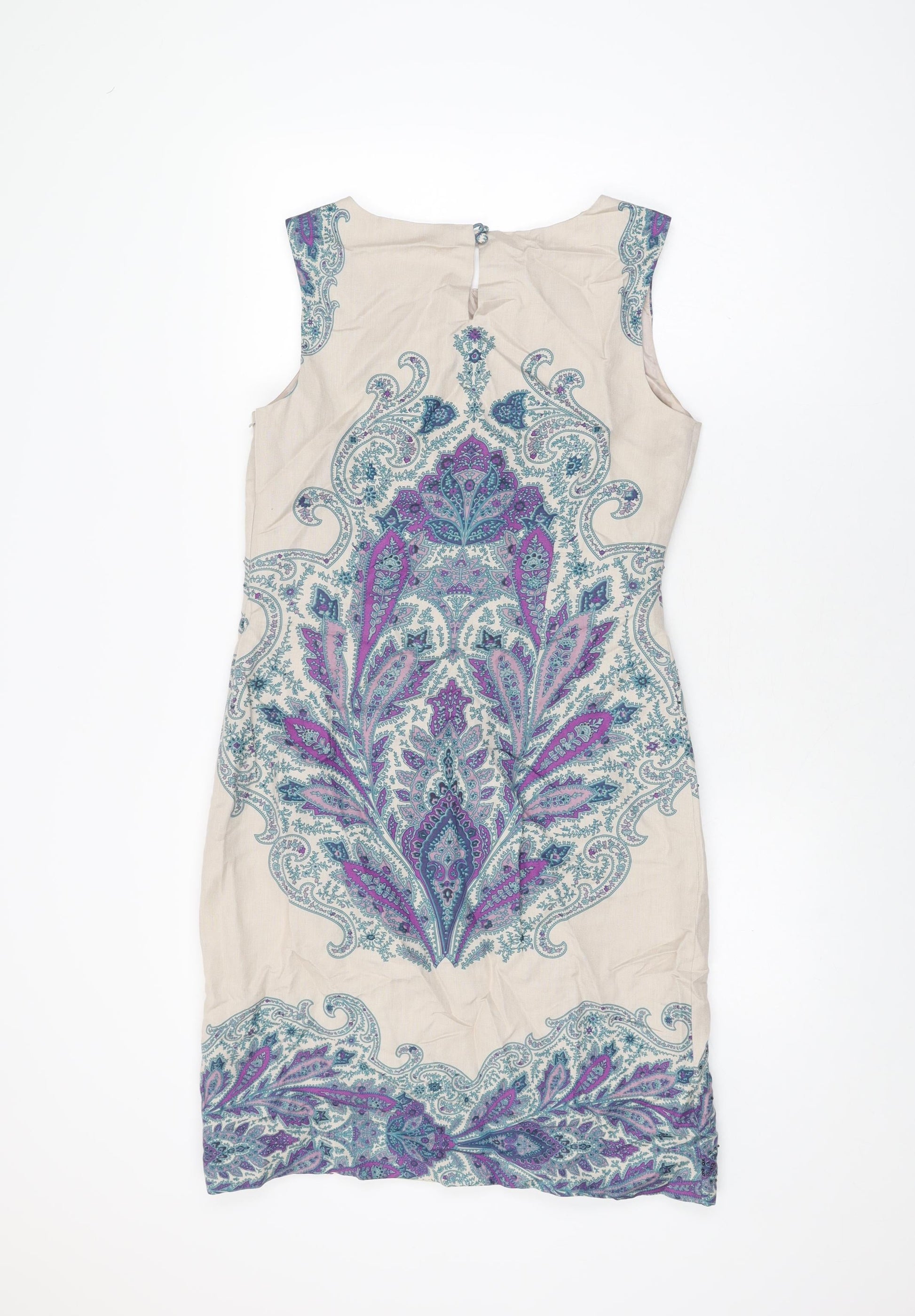 Monsoon Womens Beige Paisley Linen Shift Size 12 Round Neck Zip