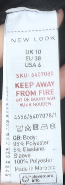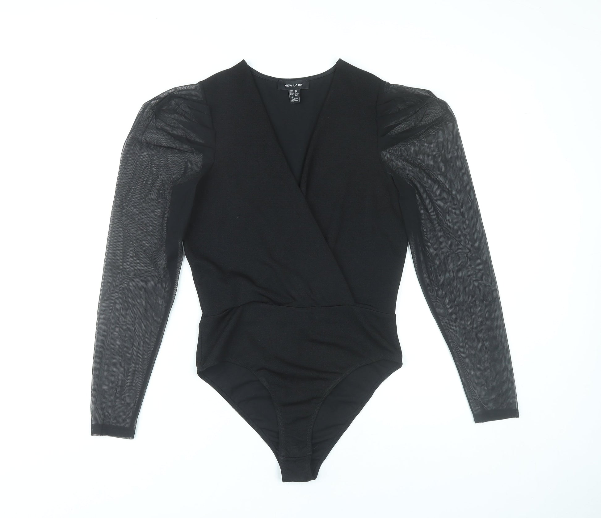 New Look Women’s Black Bodysuit UK 10 Puff Sleeve Sheer Mesh V-Neck