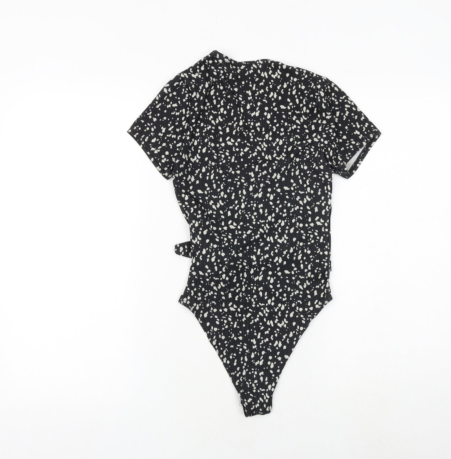 New Look Womens Black Animal Print Polyester Bodysuit One-Piece Size 8 Snap - Tie Front Detail