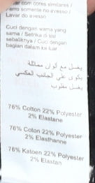 - Material Breakdown: 76% Cotton 22% Polyester 2% Elastane