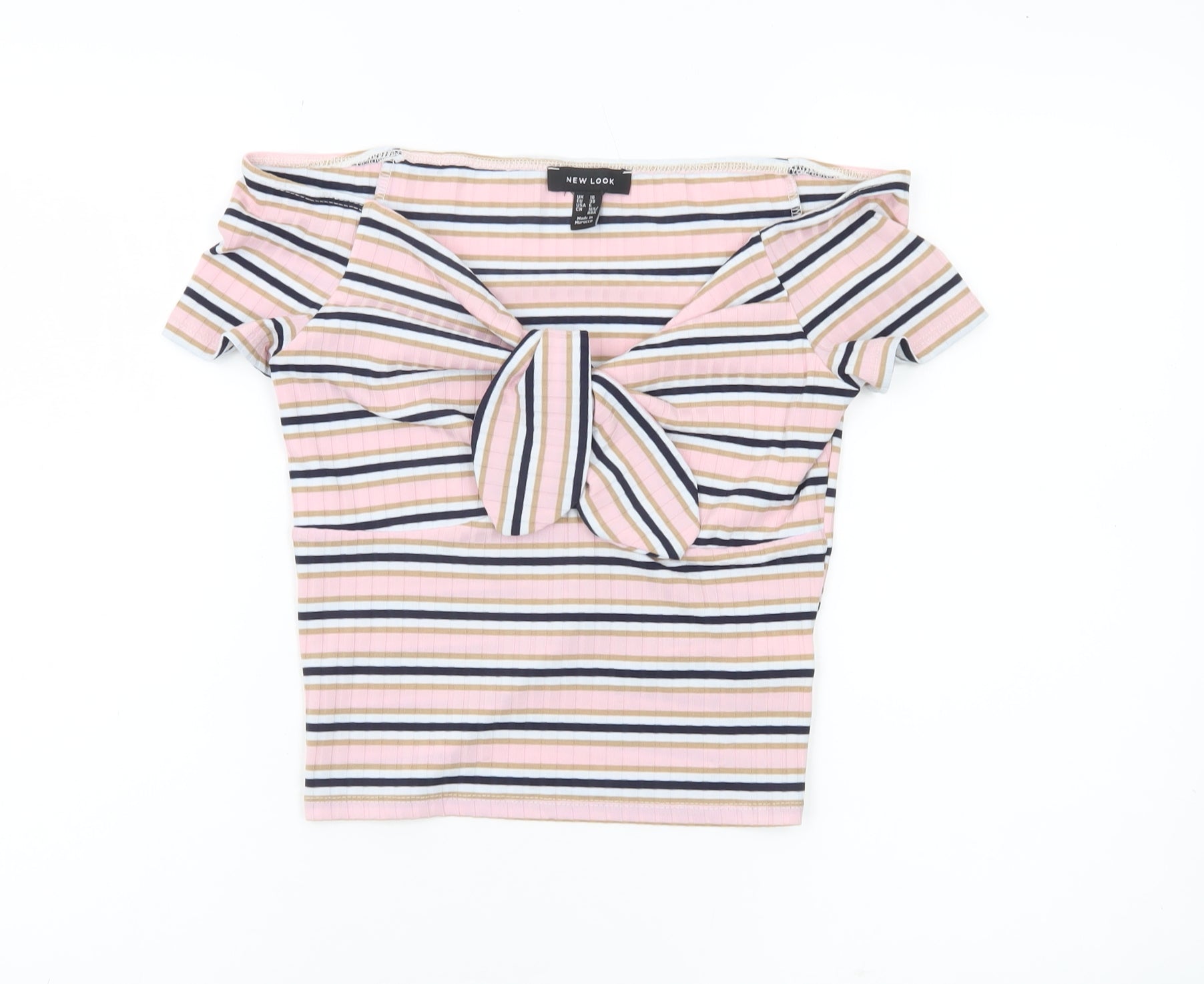 New Look Womens Multicoloured Striped Cropped Bow T-Shirt Size 10