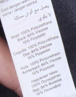 - Material Breakdown: 100% Polyurethane 84% Viscose 16% Polyester