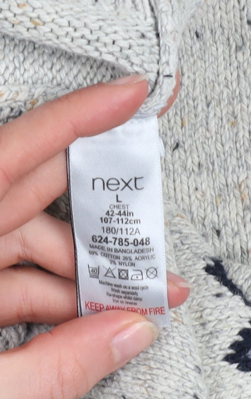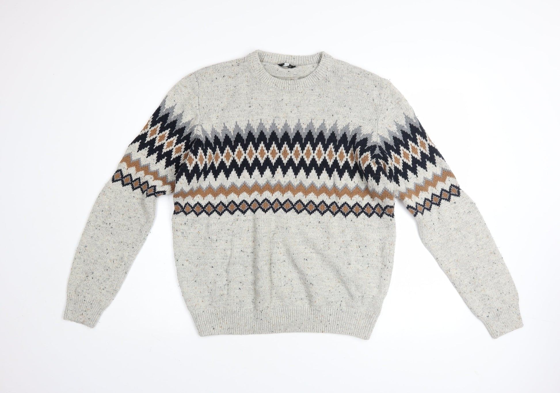 Next Men Beige Fair Isle Knit Jumper L Crew Neck Cotton Blend