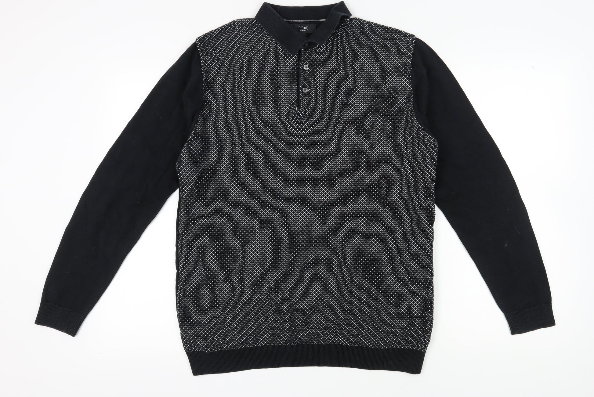 NEXT Men's Black Henley Jumper, L, Collared Geometric Knit