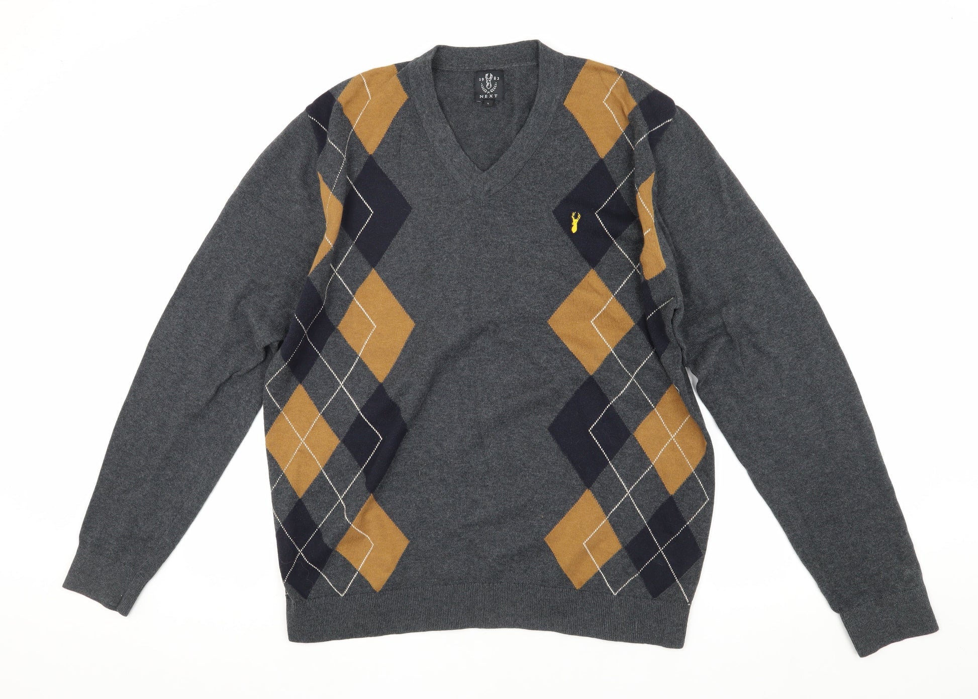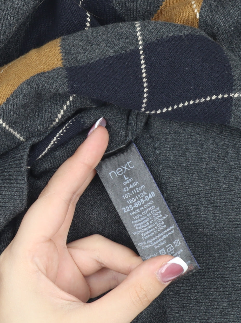 Next Men's Grey Argyle Pullover Jumper, L, Cotton V-Neck