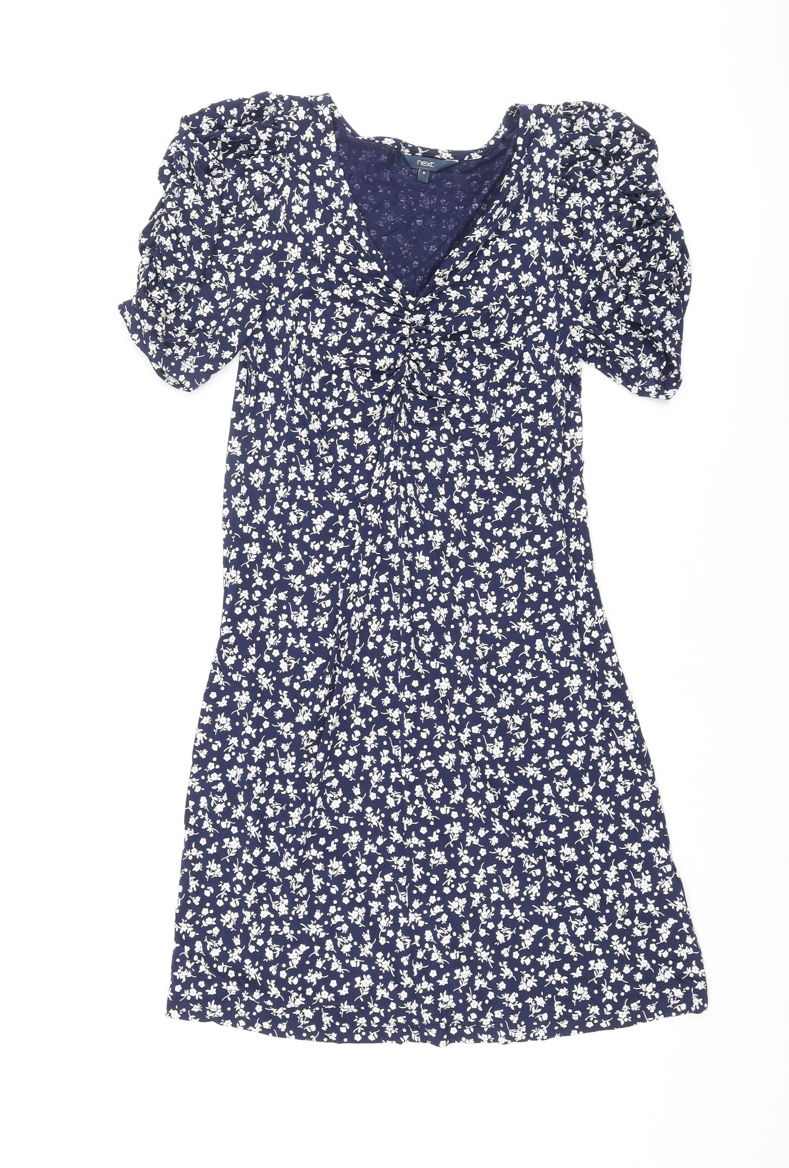 NEXT Womens Blue Floral Viscose Shift Size 8 V-Neck Pullover - Rouched Sleeve