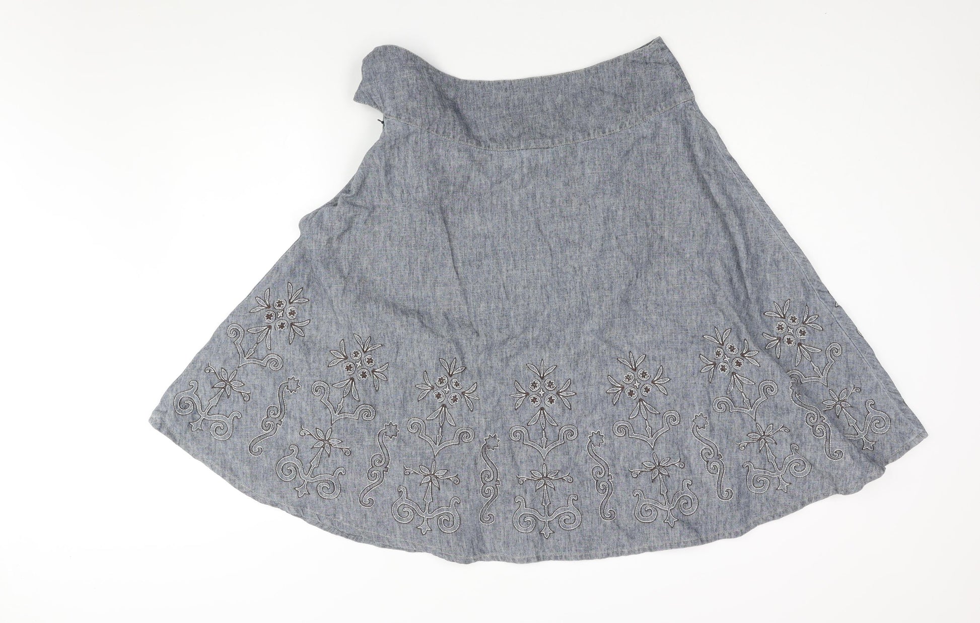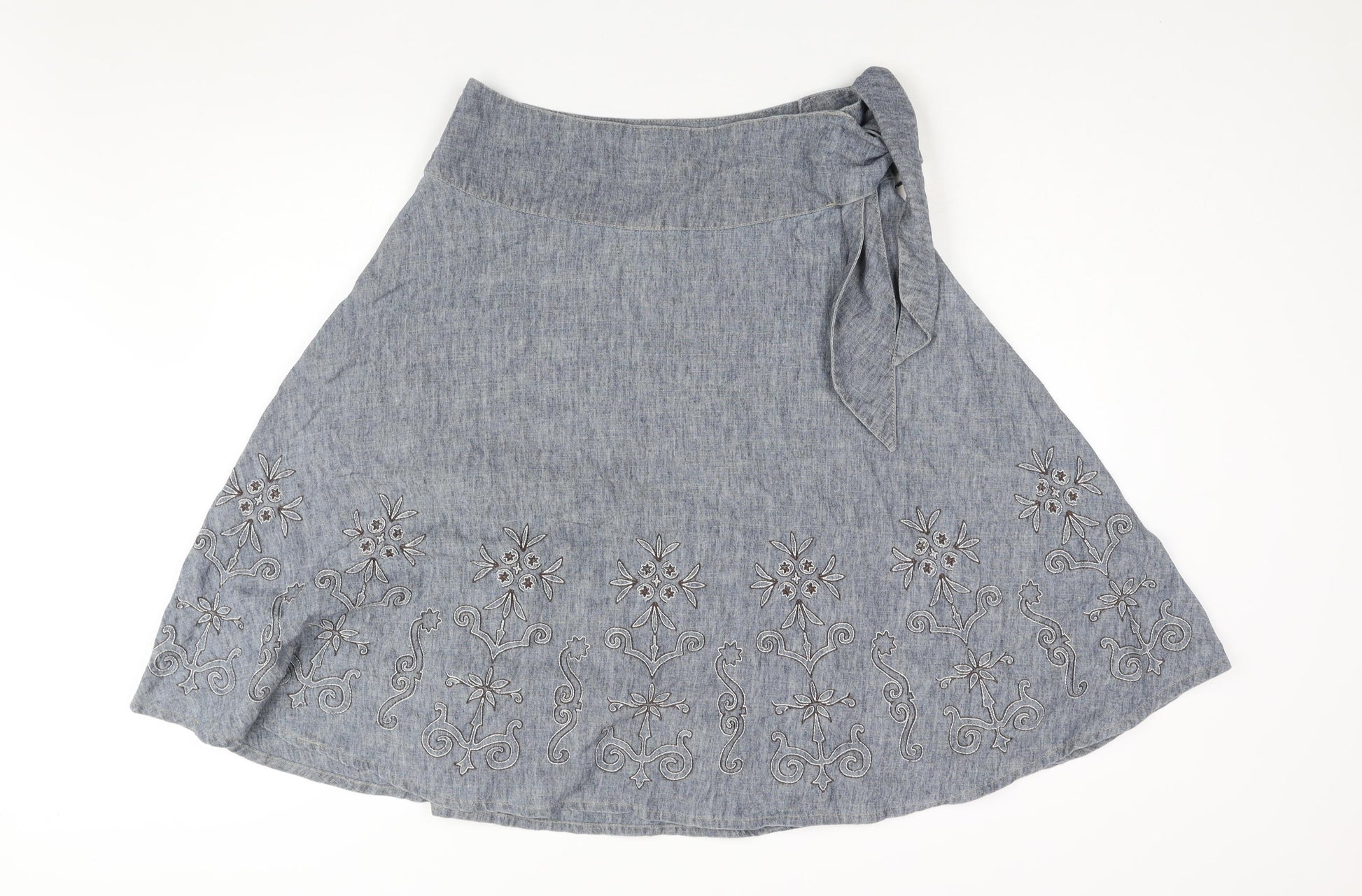NEXT Womens Blue Linen Flare Skirt Size 12 Button - Floral Embroidery Tie Detail