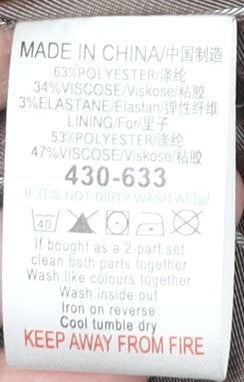 - Material Breakdown: 63% Polyester 34% Viscose 3% Elastane