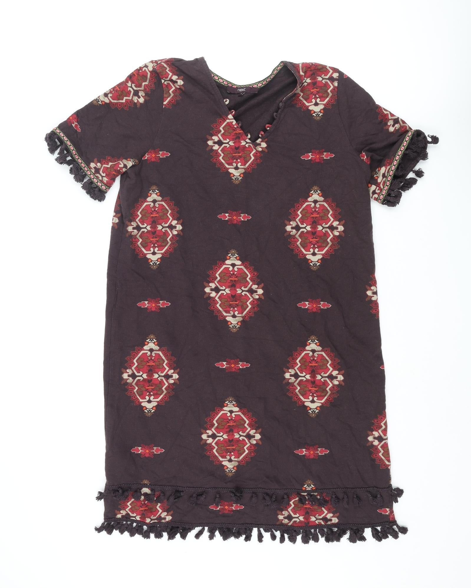 NEXT Womens Brown Geometric Cotton Shift Size 16 V-Neck Pullover - Tassle