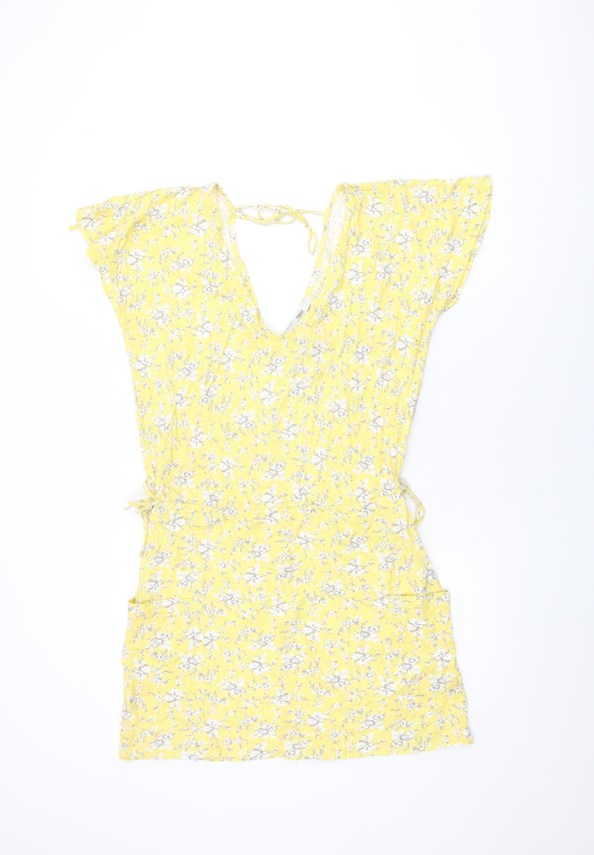NEXT Womens Yellow Floral Cotton Shift Size 12 V-Neck Tie