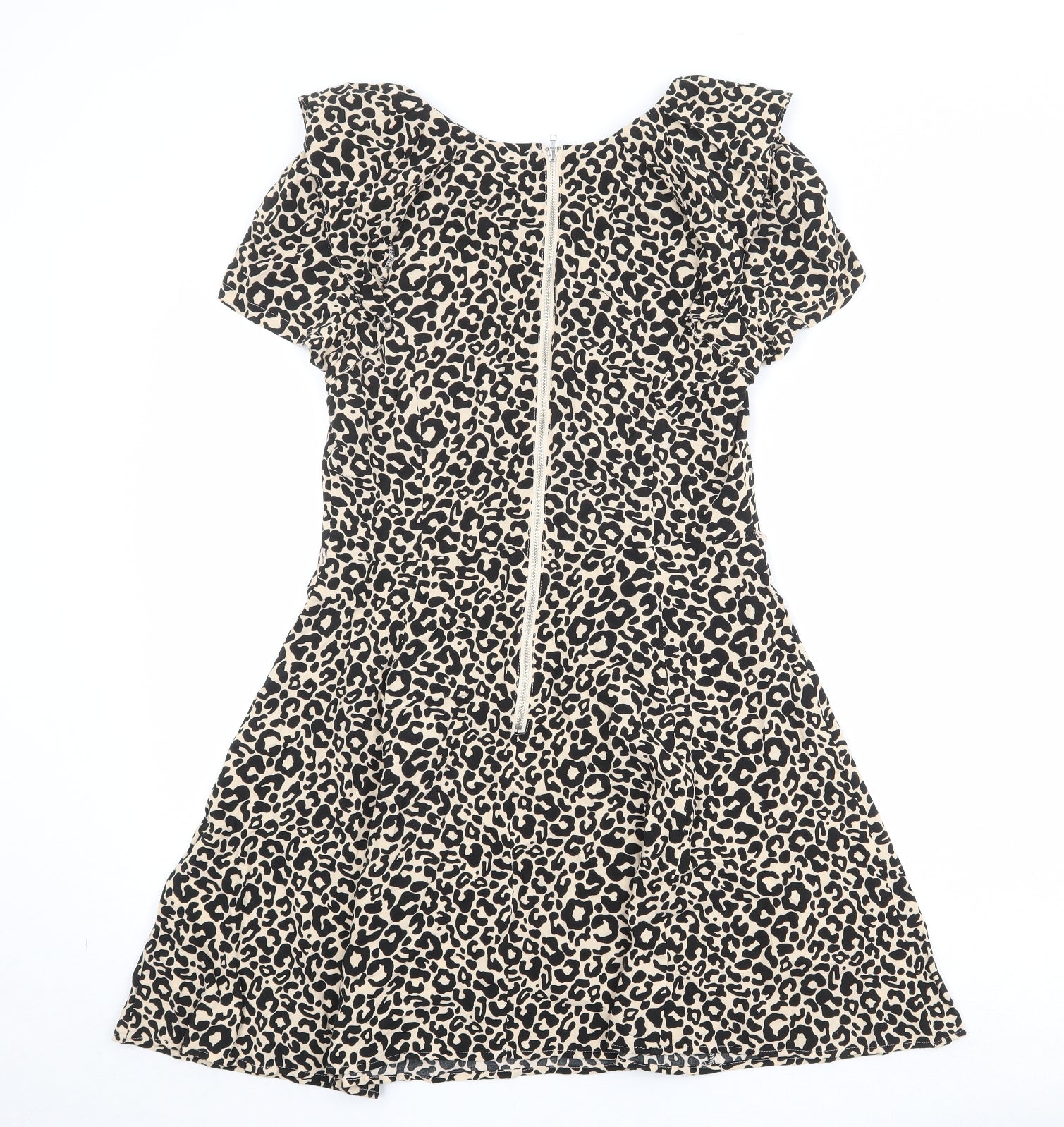 Oasis Womens Beige Animal Print Viscose Skater Dress Size 10 Round Neck Zip - Leopard Pattern
