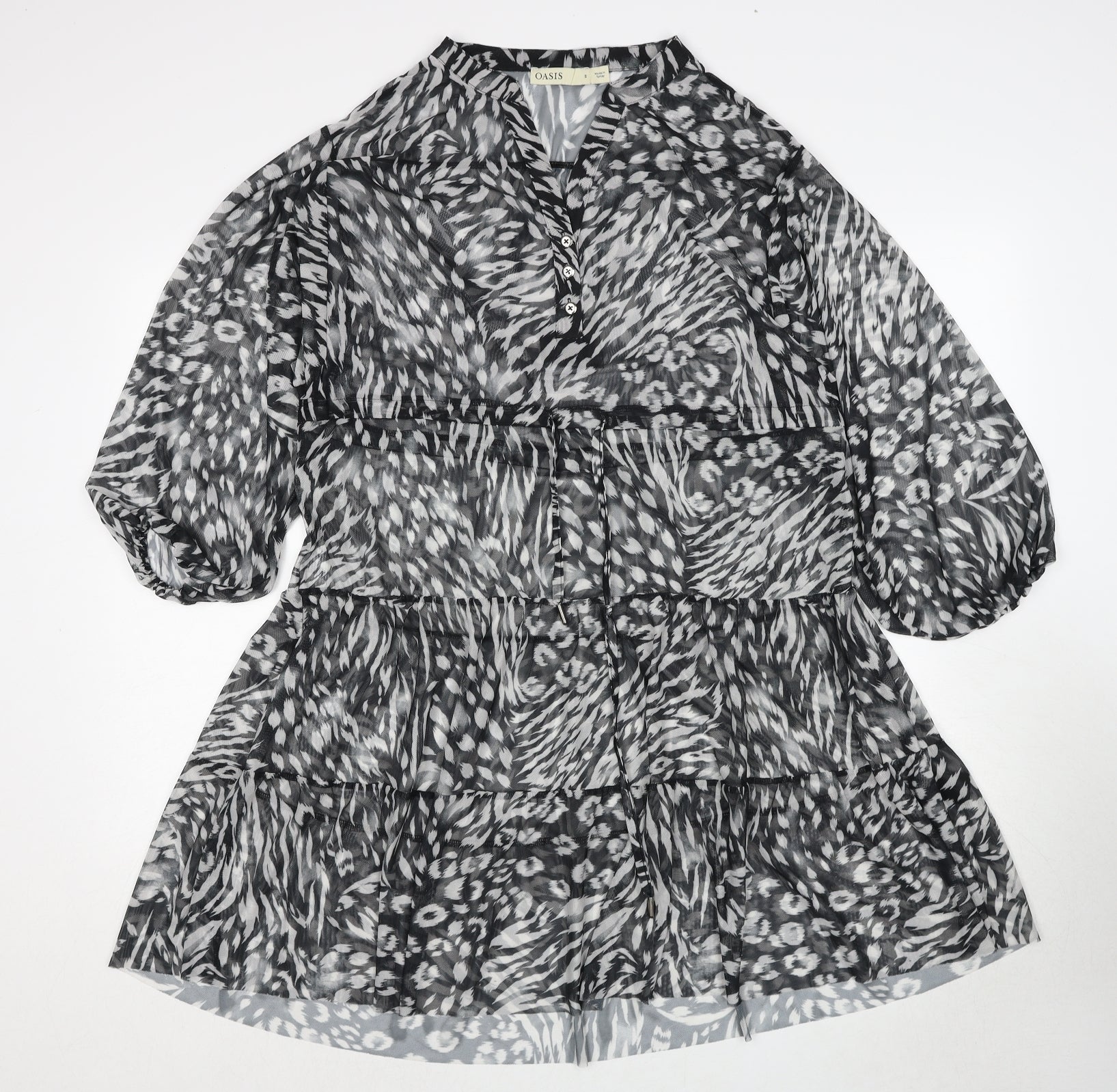 Oasis Womens Black Animal Print Polyester A-Line Size S V-Neck Drawstring - Sheer