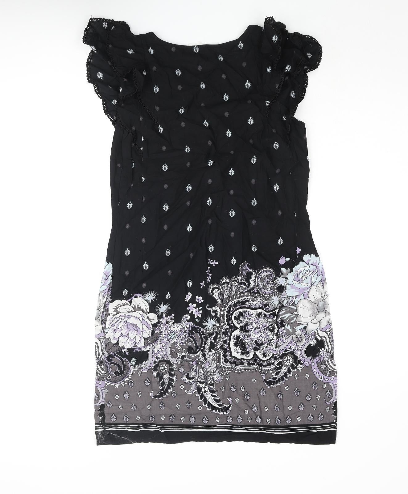 Oasis Womens Black Geometric Cotton Shift Size 10 Round Neck Pullover - Floral Paisley Print Frill