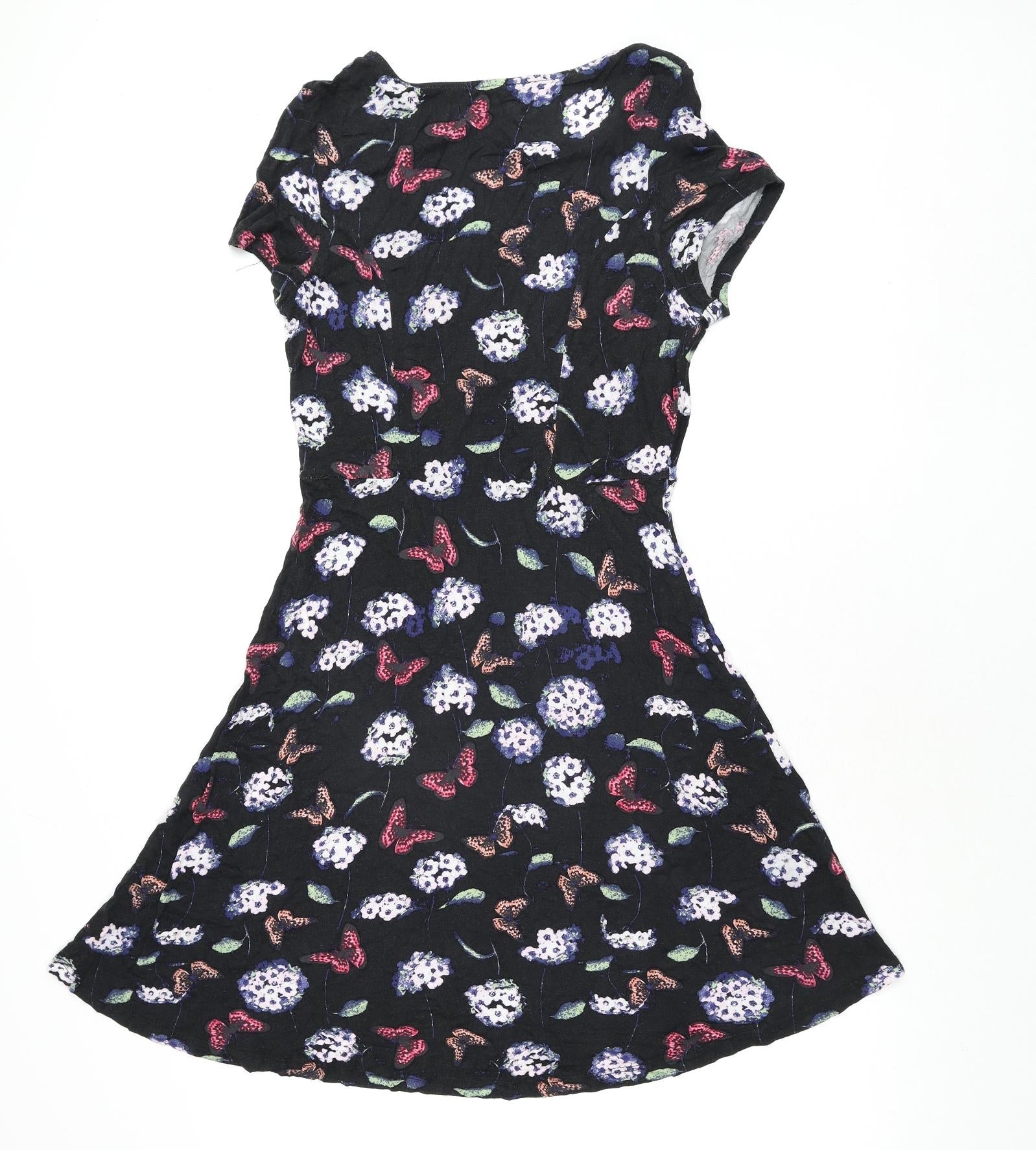 Oasis Womens Black Geometric Viscose A-Line Size M Round Neck Pullover - Flower Butterfly Print
