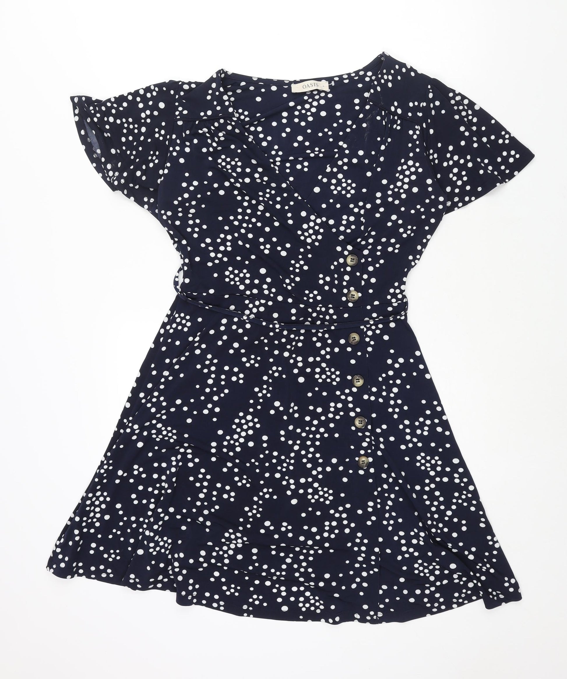 Oasis Womens Black Polka Dot Polyester A-Line Size S V-Neck Pullover - Button Detail Belted