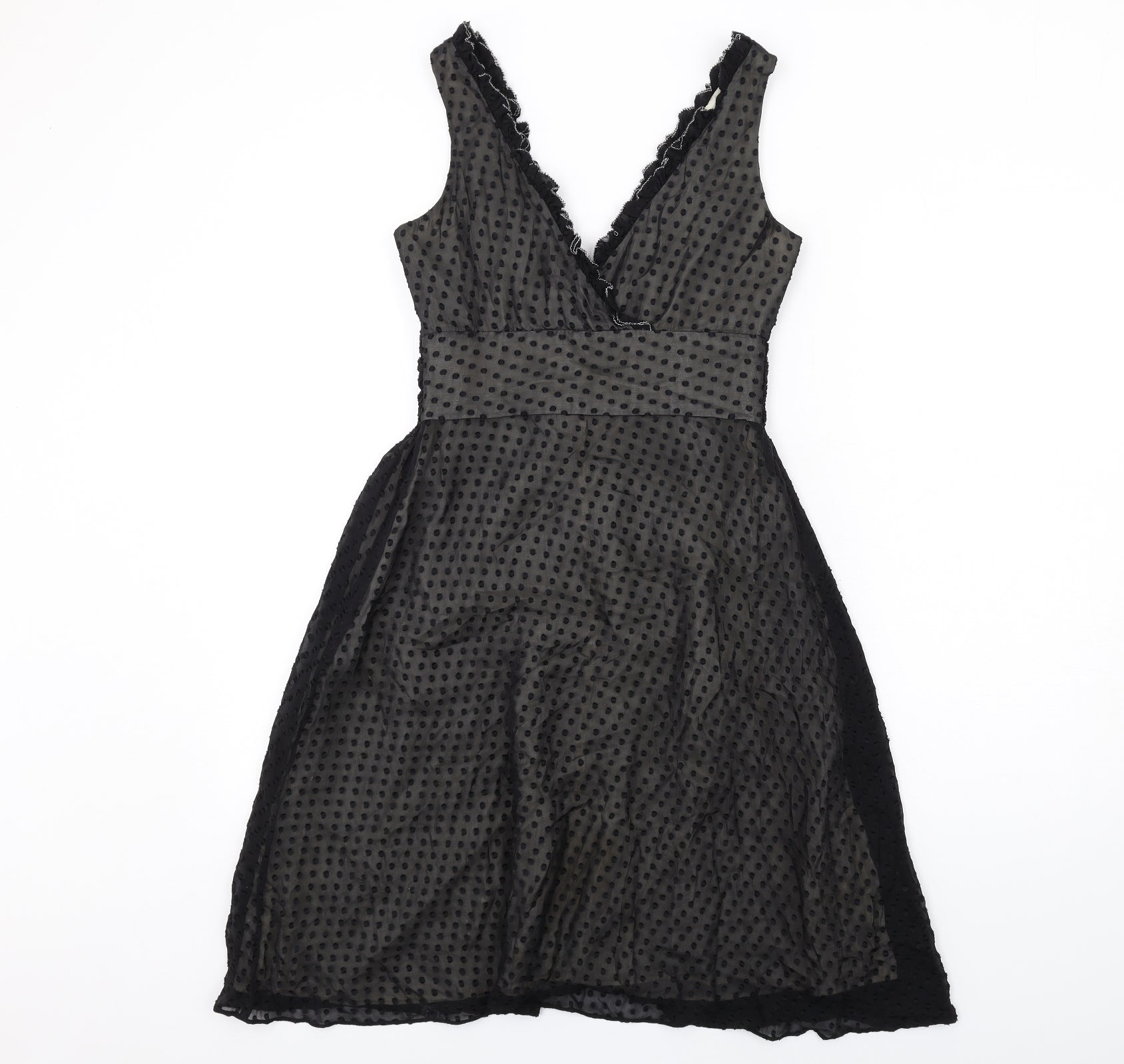 Oasis Womens Black Polka Dot Silk A-Line Size 8 V-Neck Zip - Frill Detail