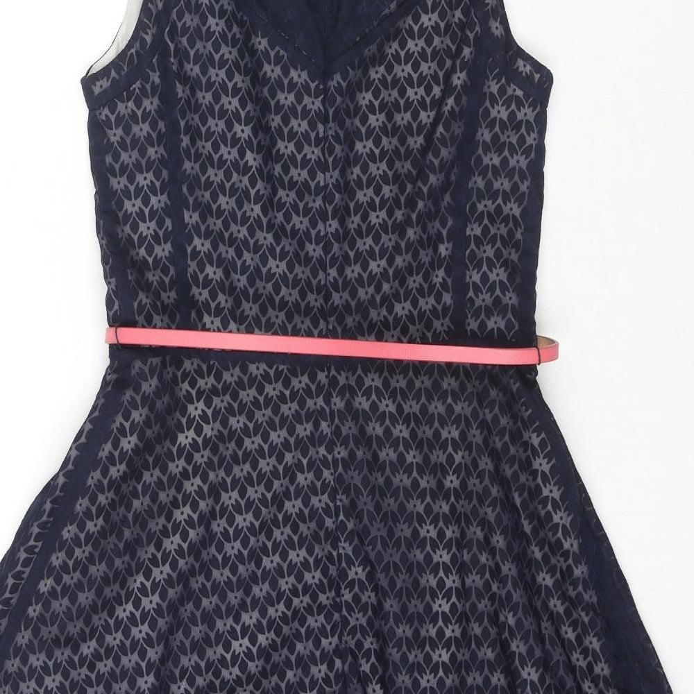 Oasis Womens Blue Geometric Cotton A-Line Size 8 Round Neck Pullover - Belted