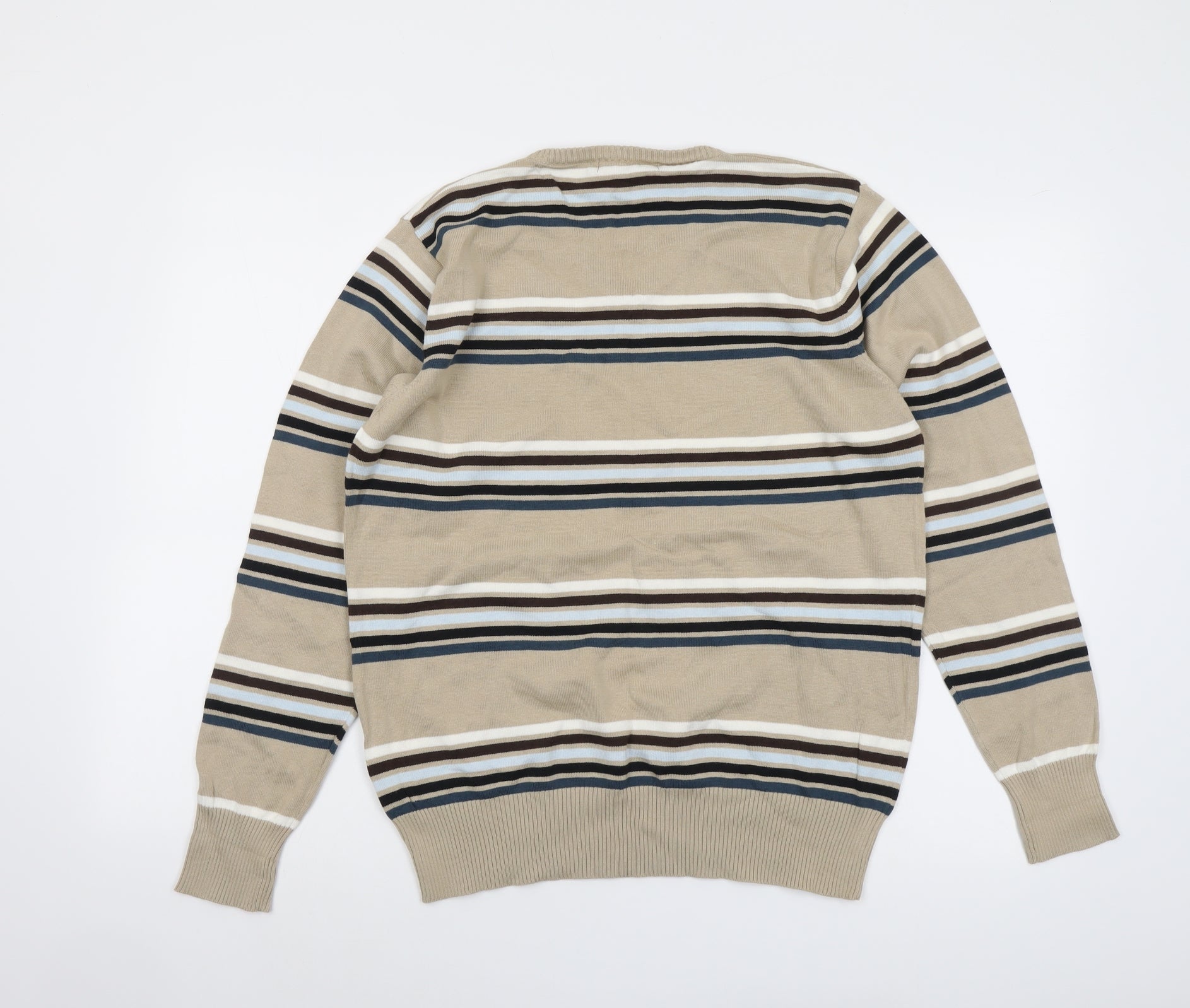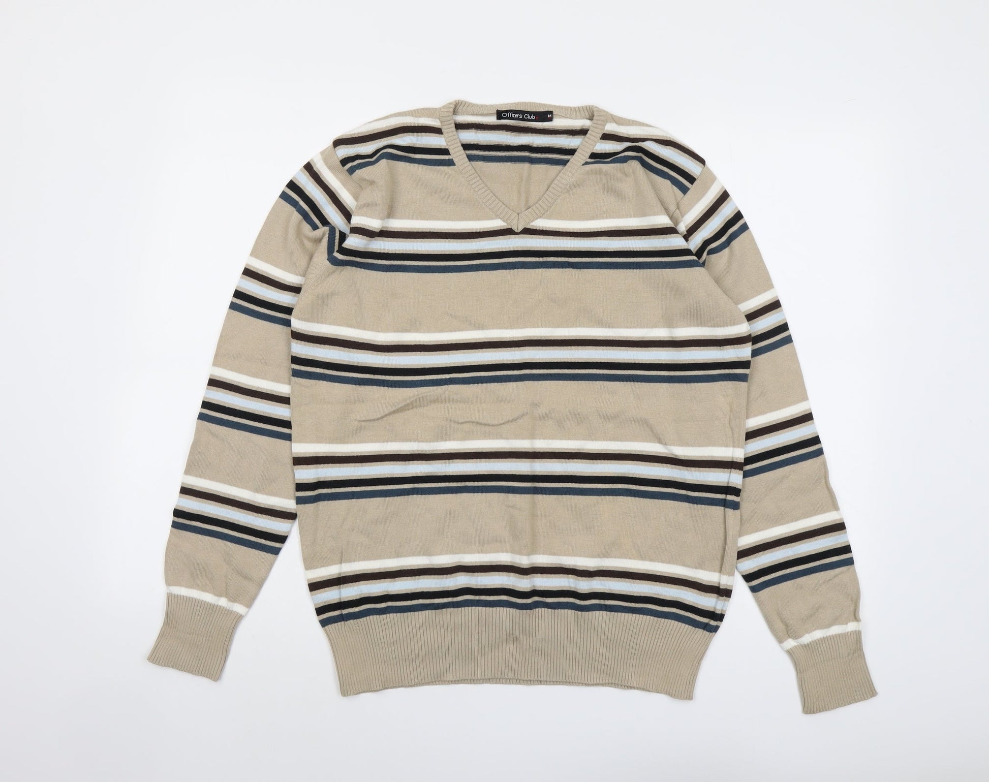 Officers Club Mens Beige V-Neck Striped Cotton Pullover Jumper Size M Long Sleeve