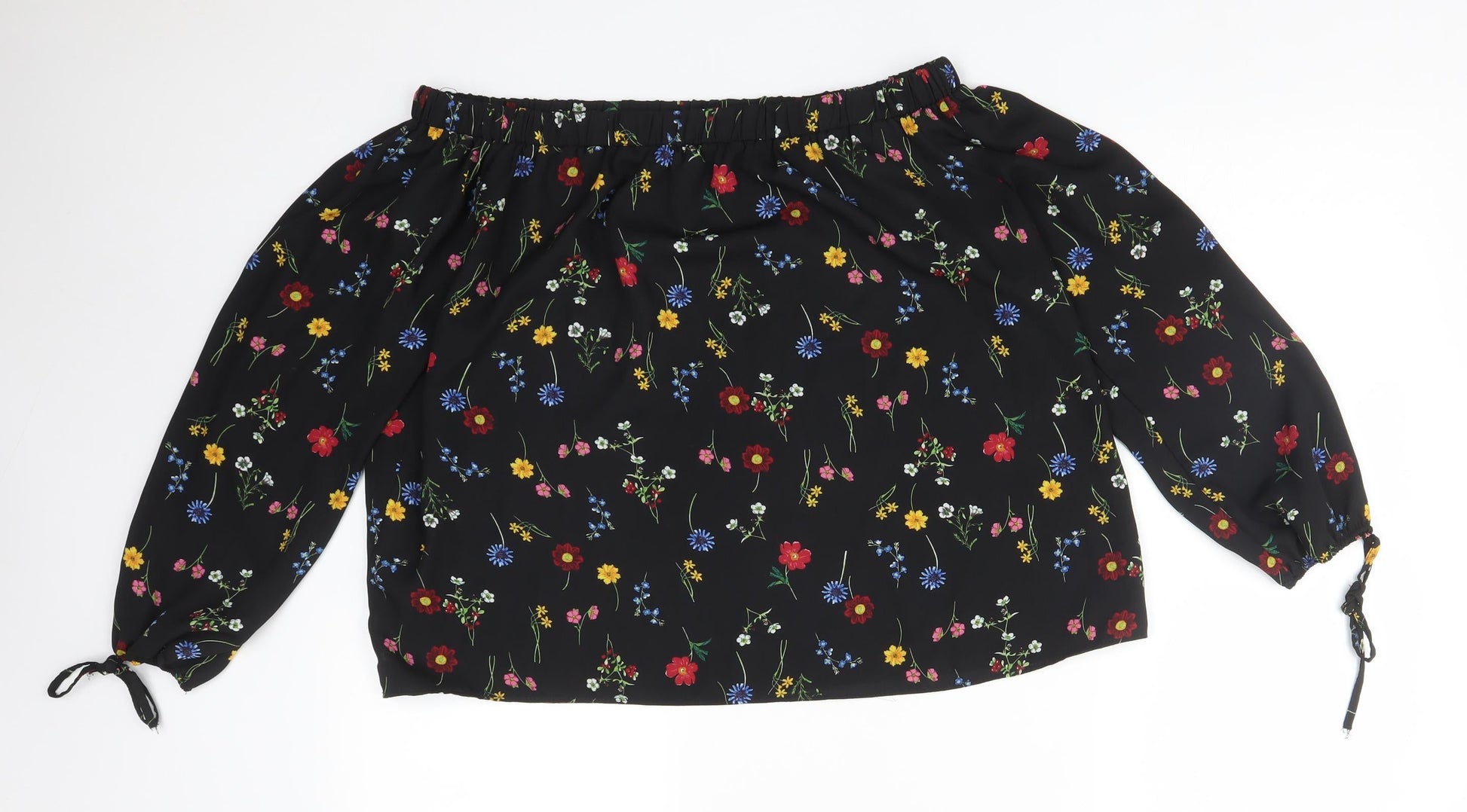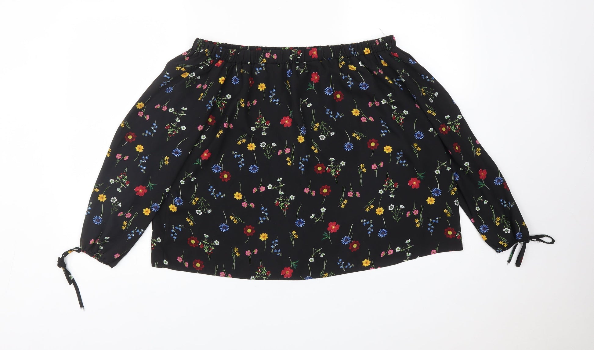 Papaya Womens Black Floral Polyester Basic T-Shirt Size 12 Off the Shoulder