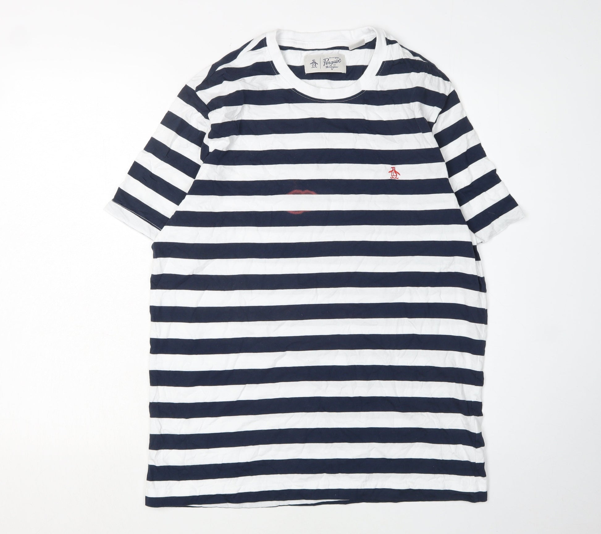 Penguin Men's Blue & White Striped T-Shirt, Size L