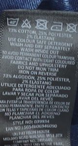 - Material Breakdown: 73% Cotton 25% Polyester 2% Elastane