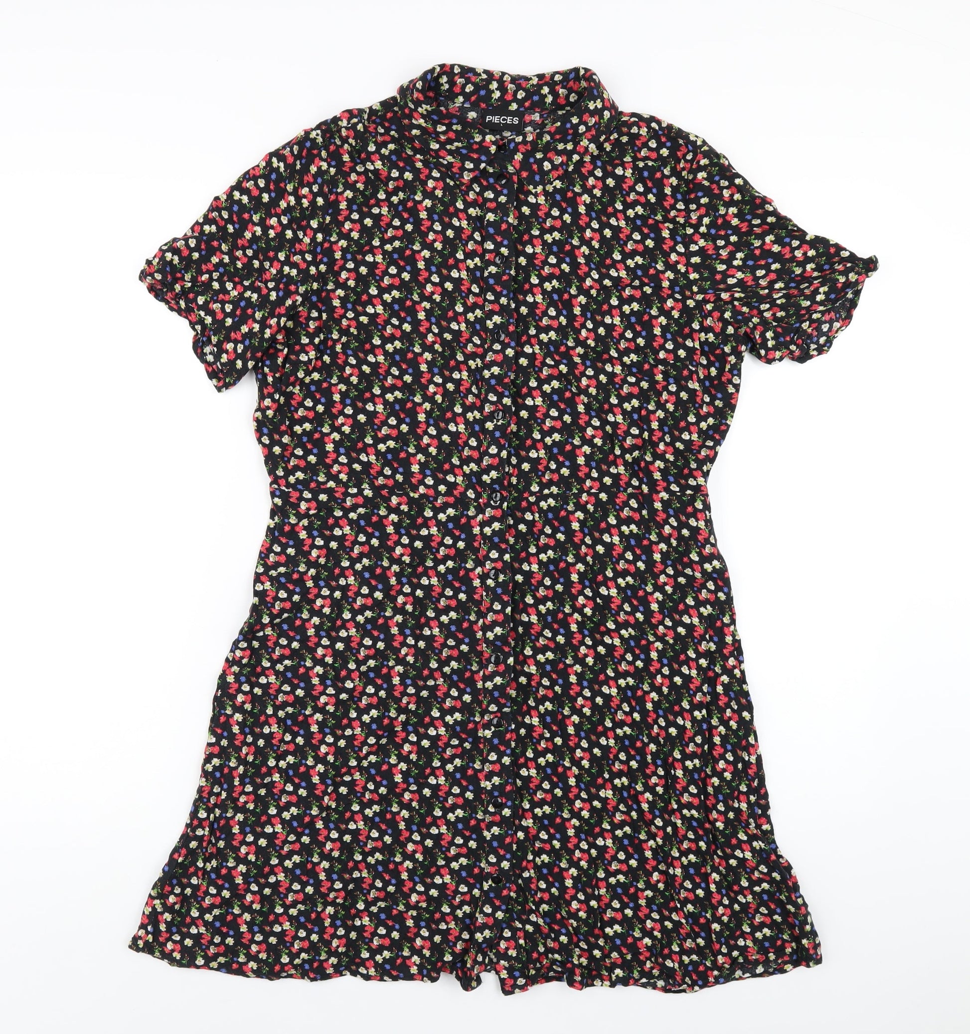 Pieces Womens Black Floral Viscose Shirt Dress Size L Collared Button