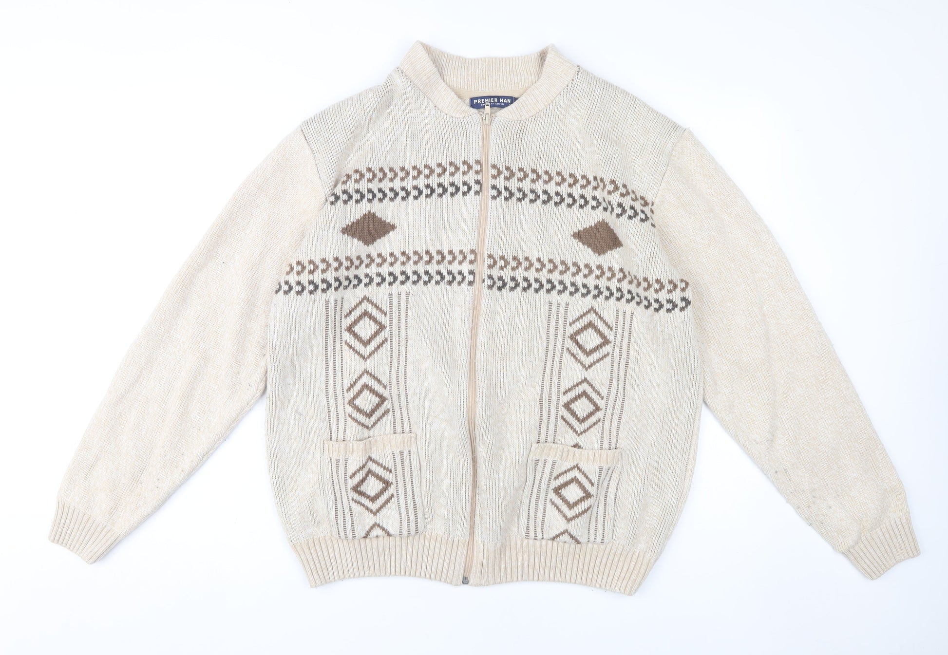 Premier Man Men's Beige Full Zip Cardigan, L, Geometric Knit