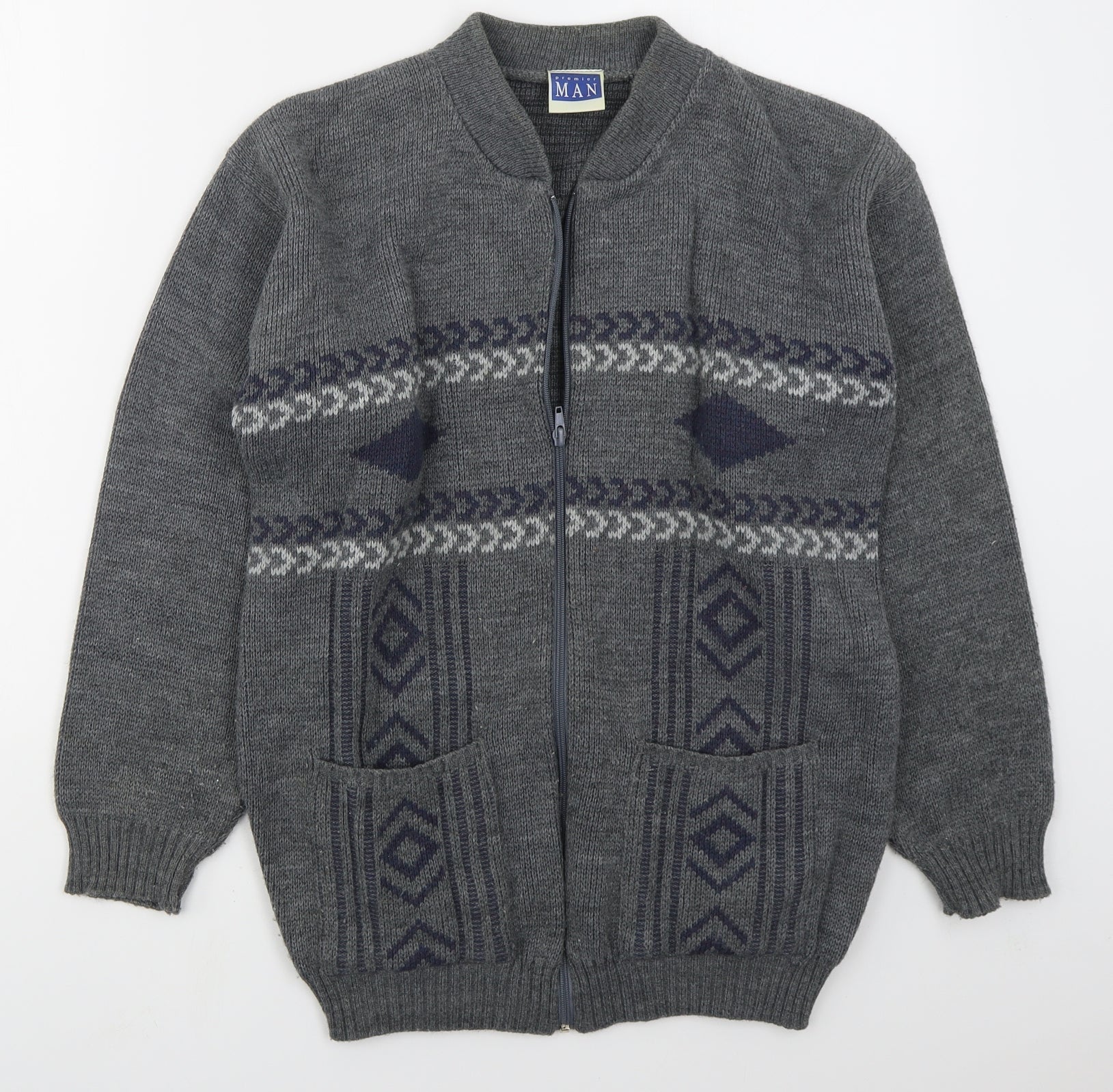 Premier Man Mens Grey V-Neck Geometric Acrylic Full Zip Jumper Size S