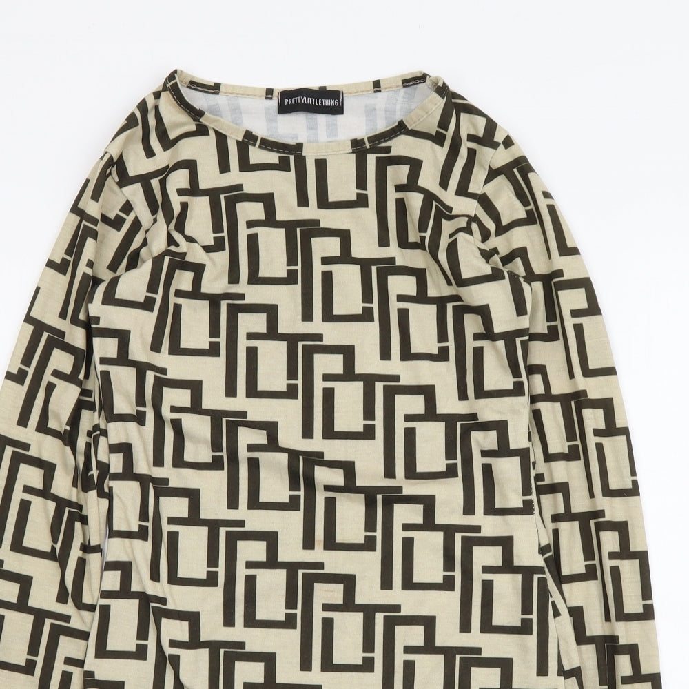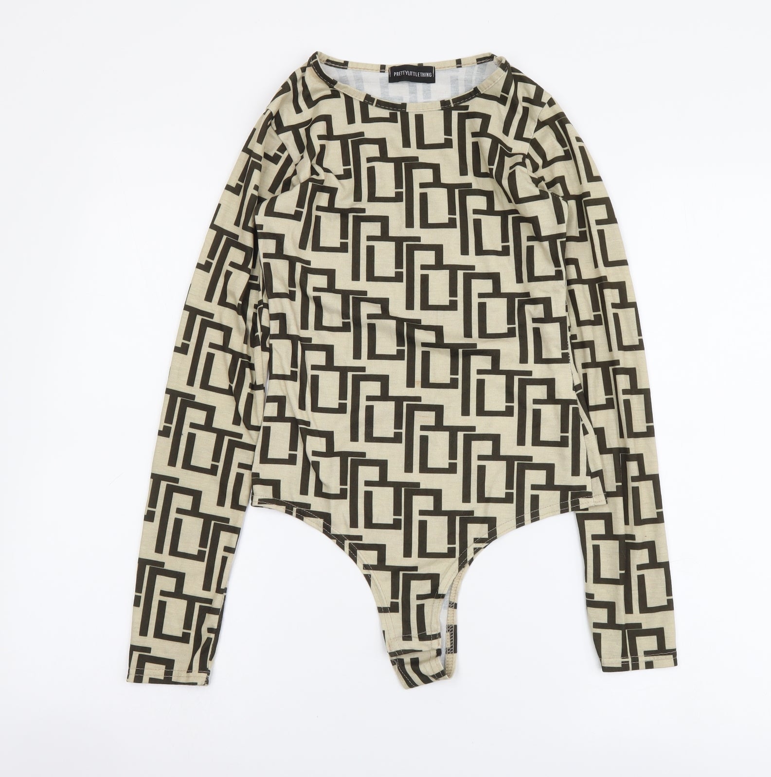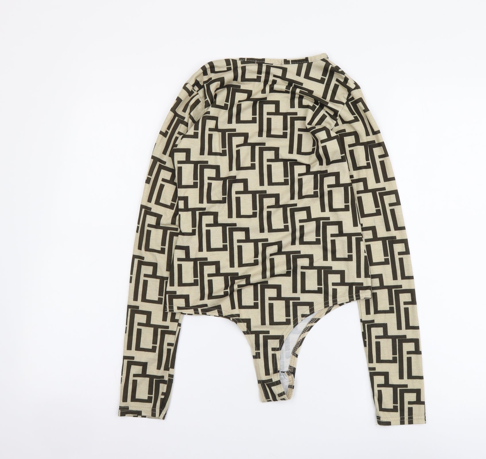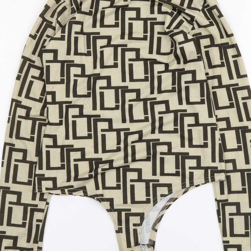 PRETTYLITTLETHING Womens Beige Geometric Polyester Bodysuit One-Piece Size 8 Snap