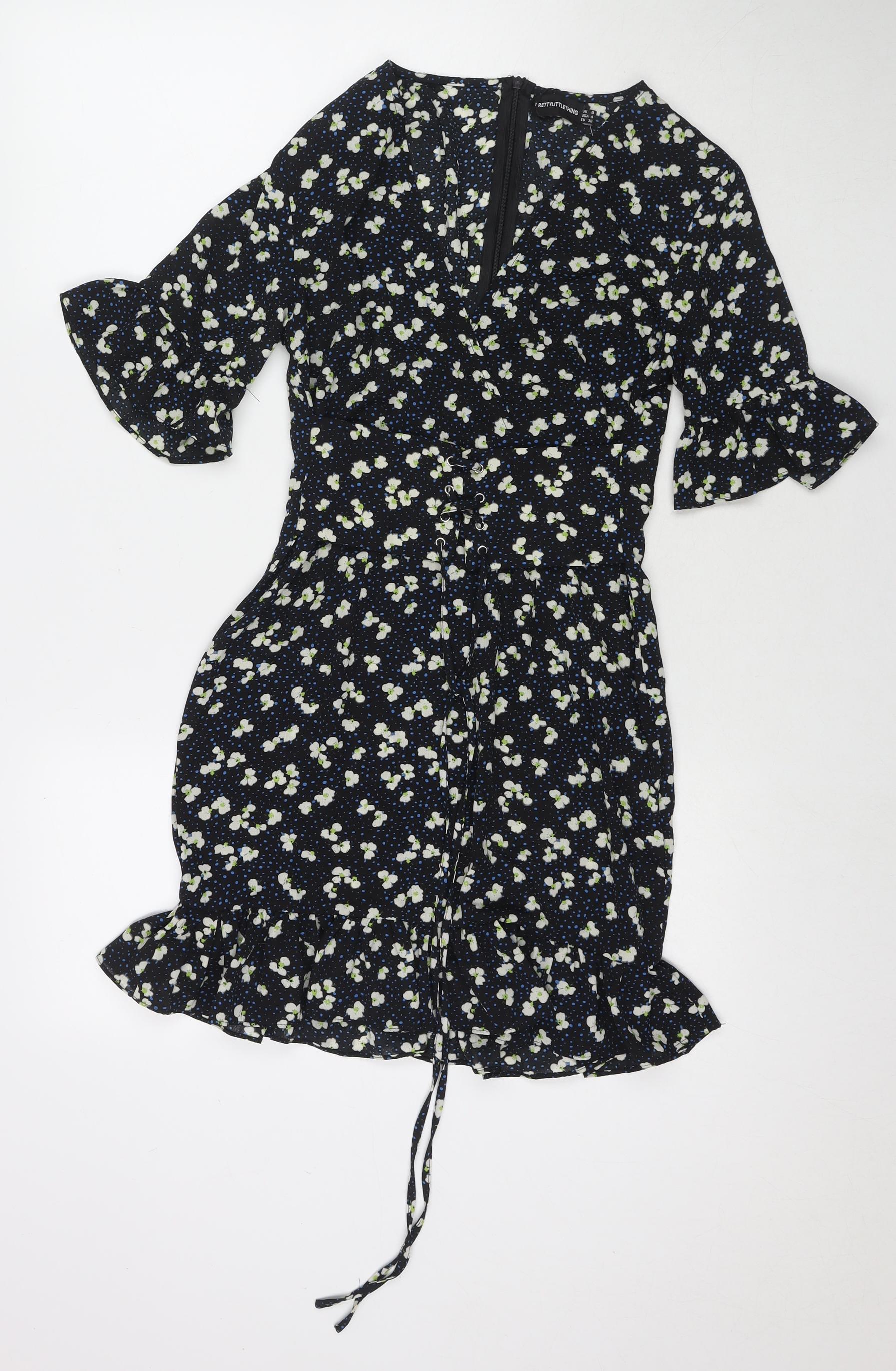 PRETTYLITTLETHING Womens Black Floral Polyester Fit & Flare Size 8 V-Neck Zip