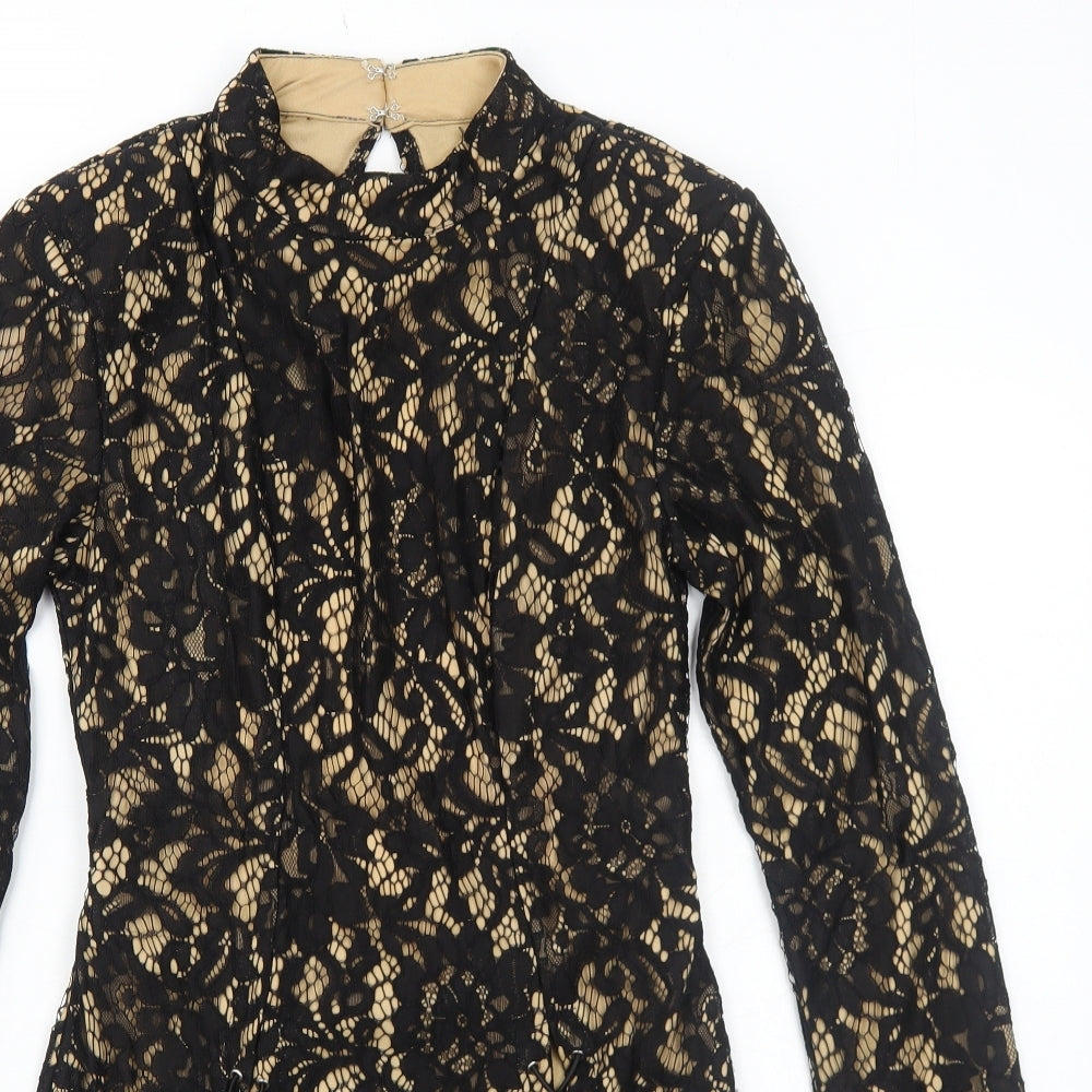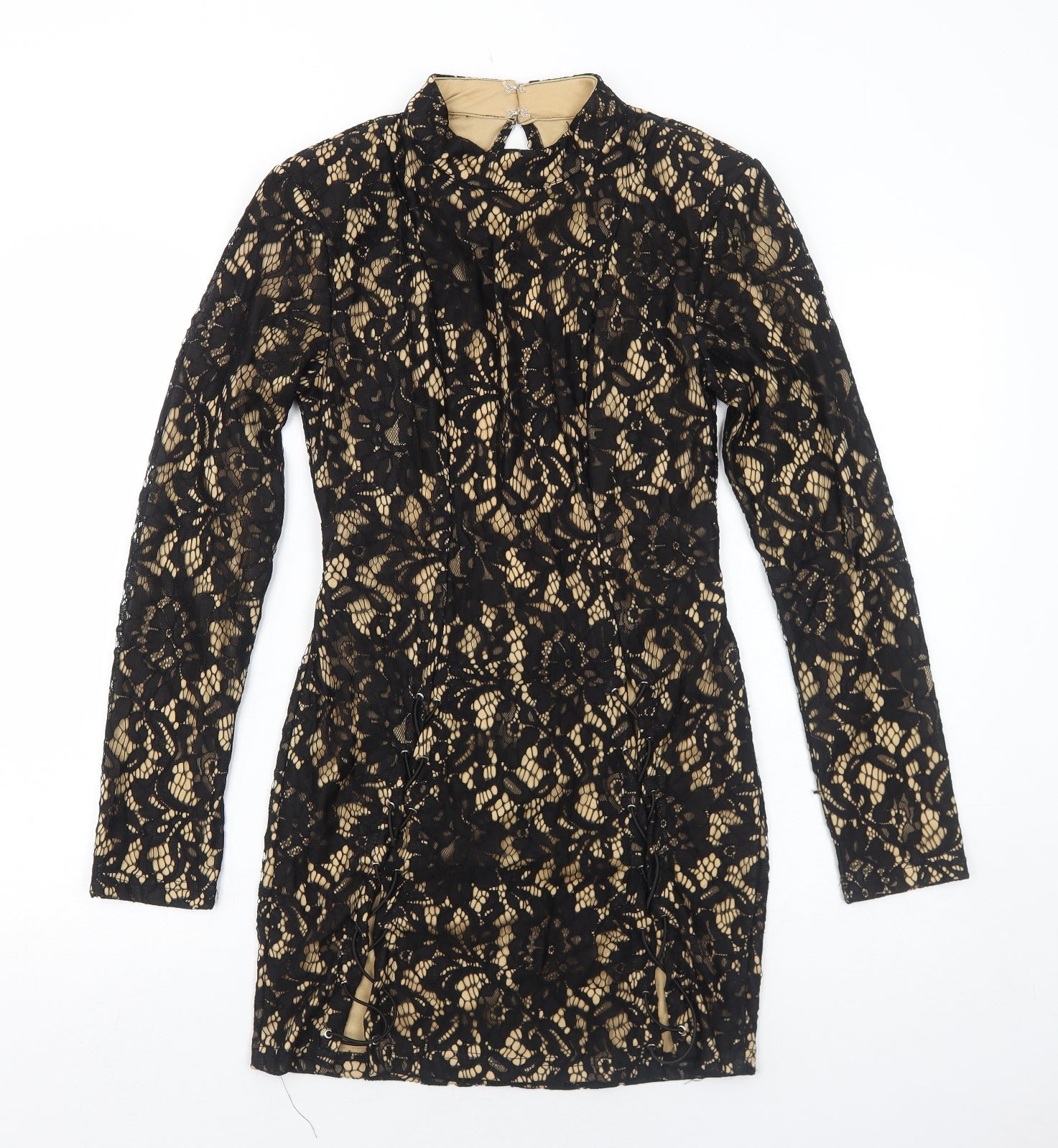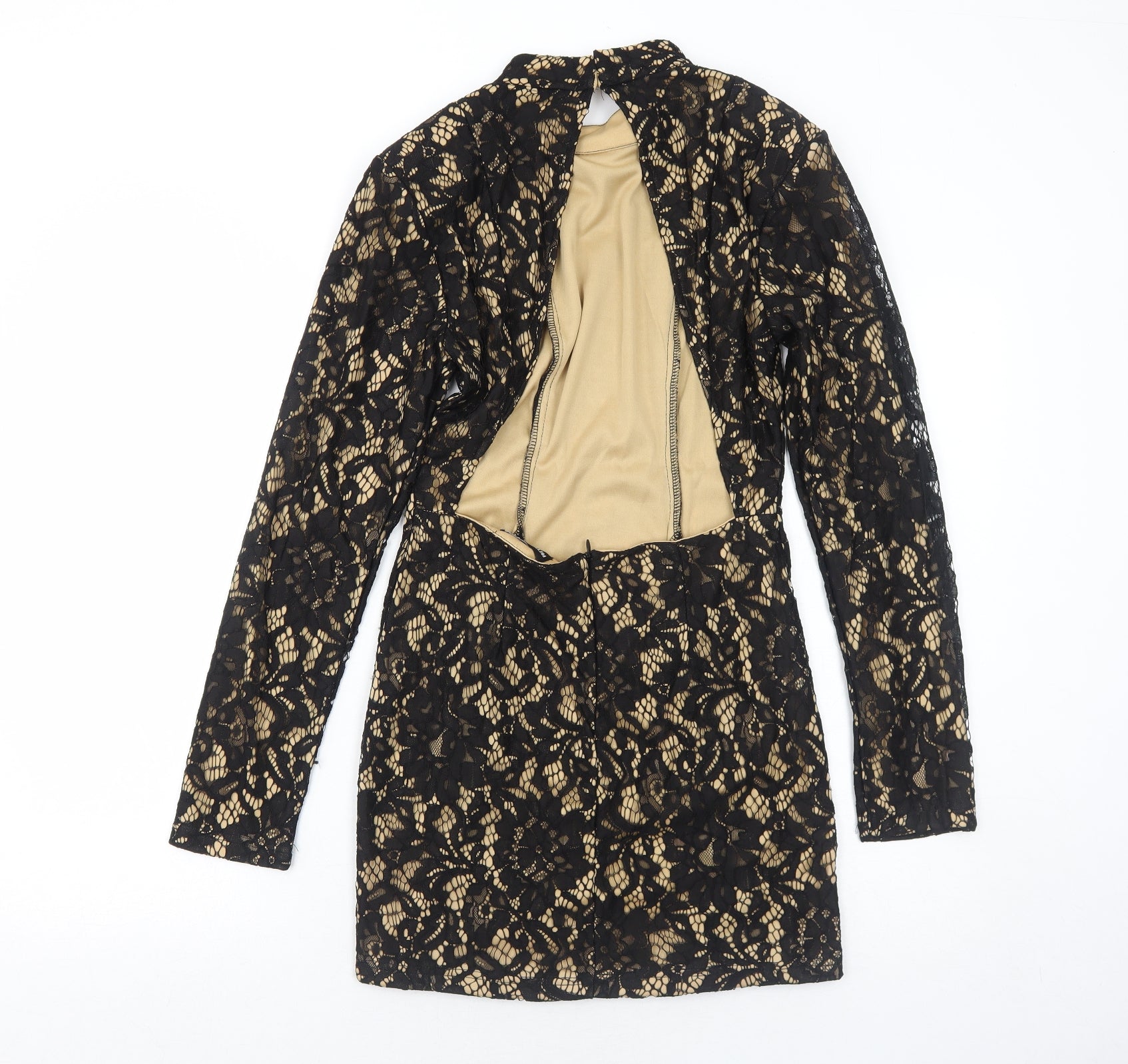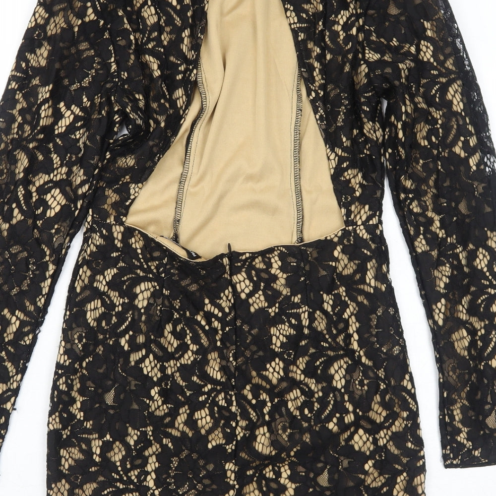 PRETTYLITTLETHING Womens Black Geometric Polyester Bodycon Size 10 Round Neck Zip