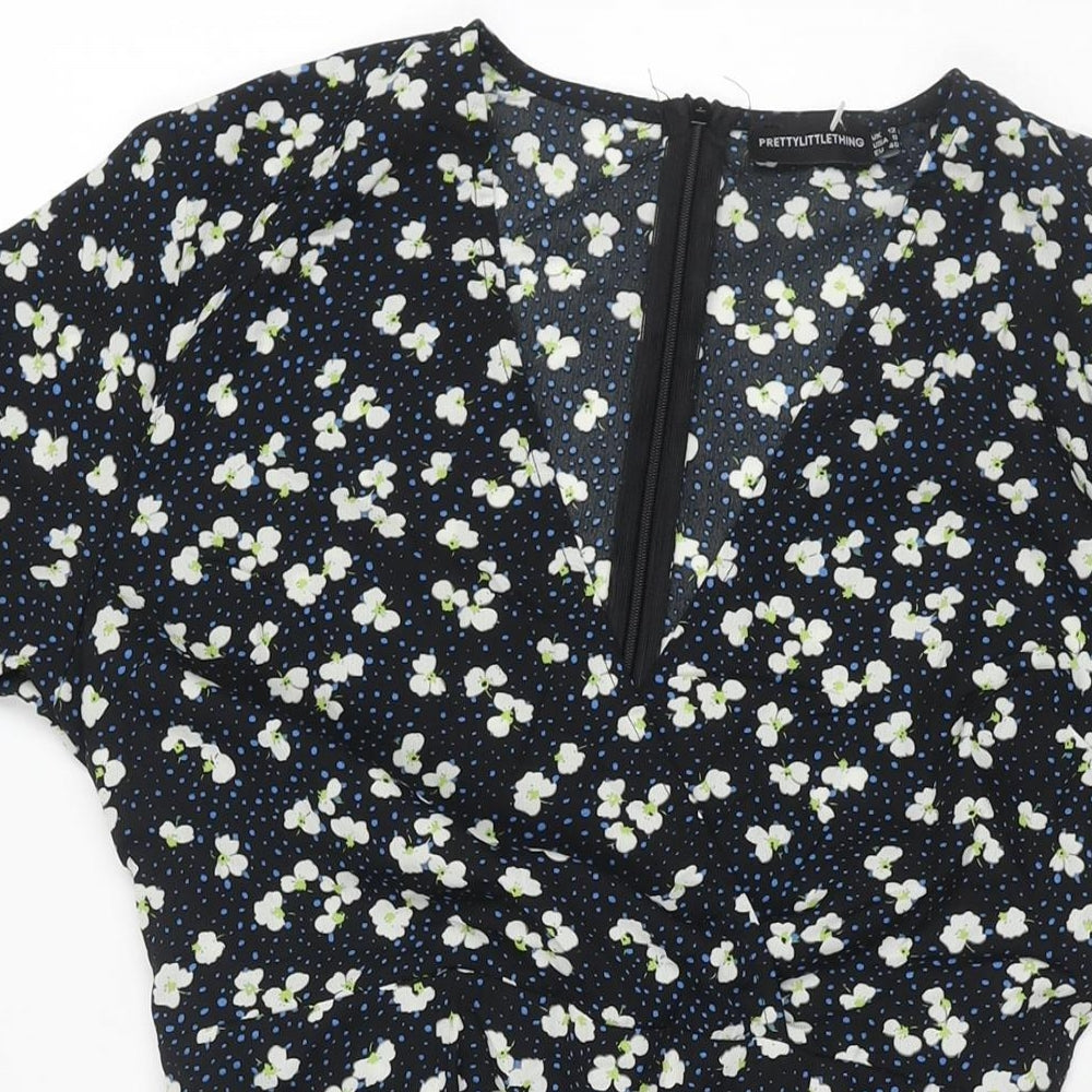 PRETTYLITTLETHING Womens Black Geometric Polyester Mini Size 12 V-Neck Zip - Frill Lace Up Back Floral Print