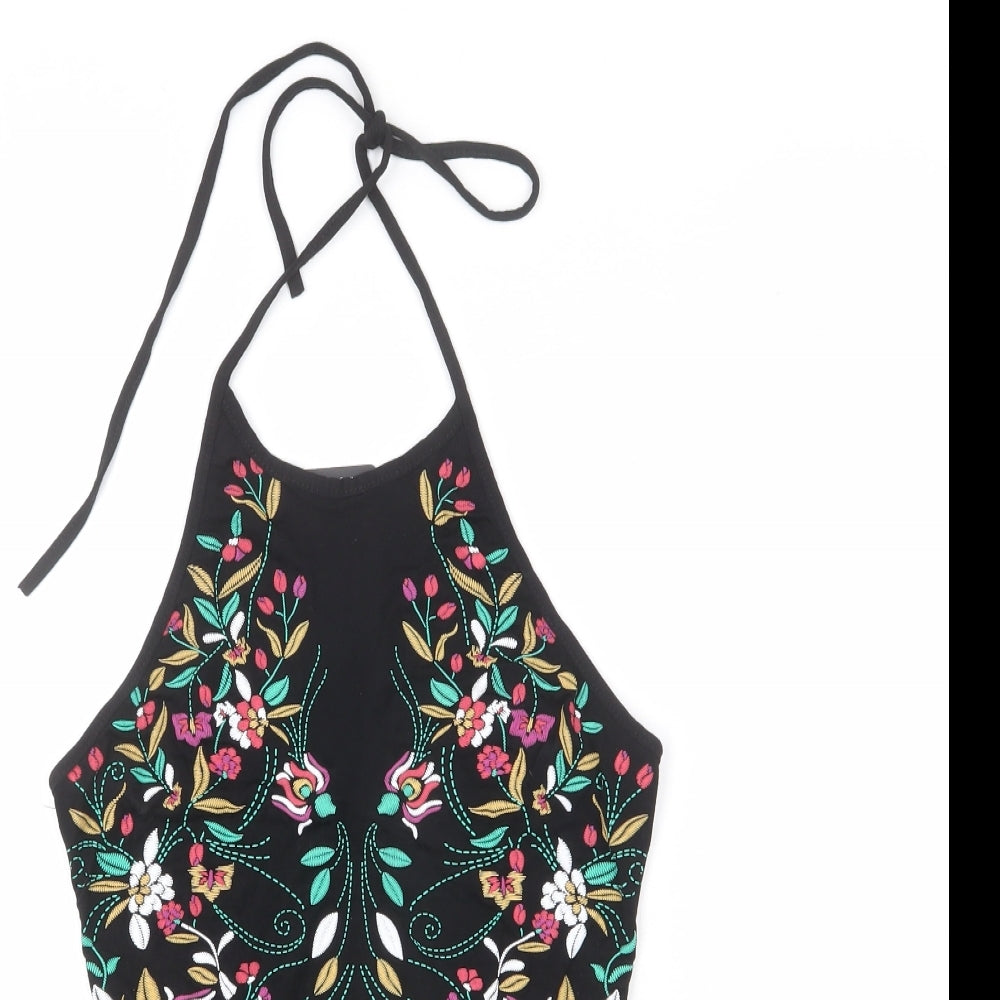 PRETTYLITTLETHING Womens Black Vinyl Bodysuit One-Piece Size 4 Snap - Floral Embroidery
