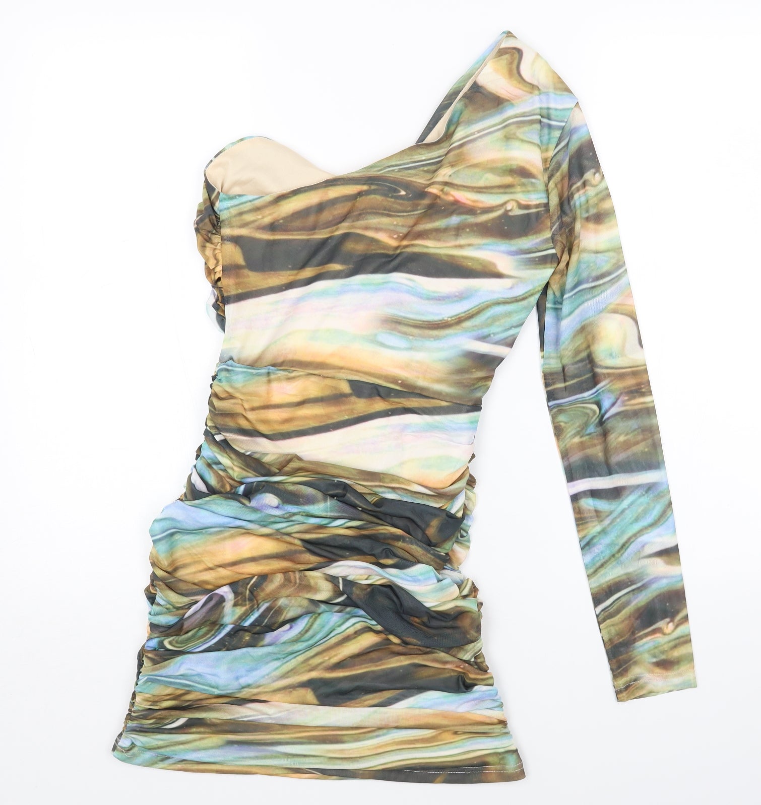 PRETTYLITTLETHING Womens Multicoloured Geometric Polyester Bodycon Size 8 Off the Shoulder Zip