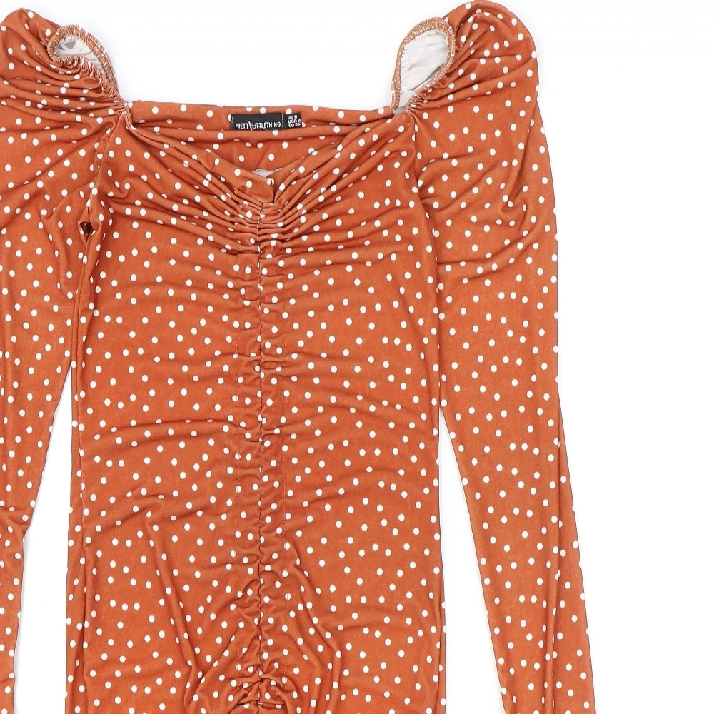 PRETTYLITTLETHING Womens Orange Polka Dot Polyester Bodycon Size 8 V-Neck Pullover