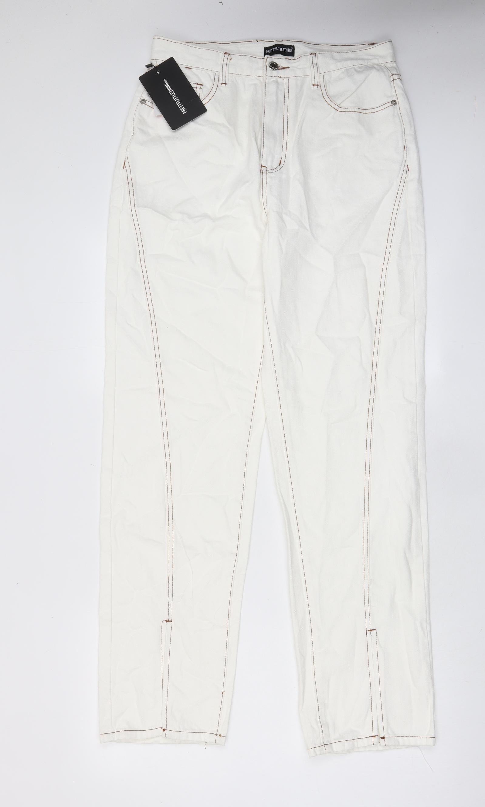 PRETTYLITTLETHING Womens White Cotton Straight Jeans Size 12 L32 in Regular Zip - Pockets, Split hems