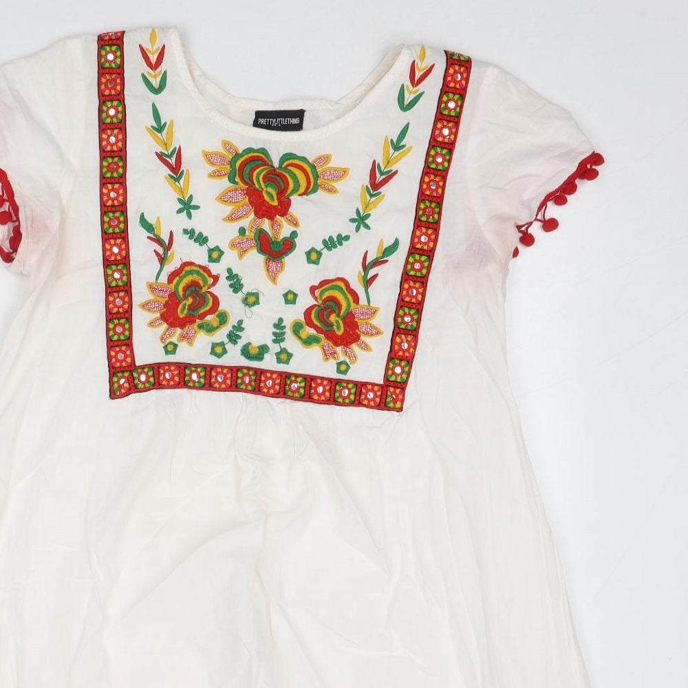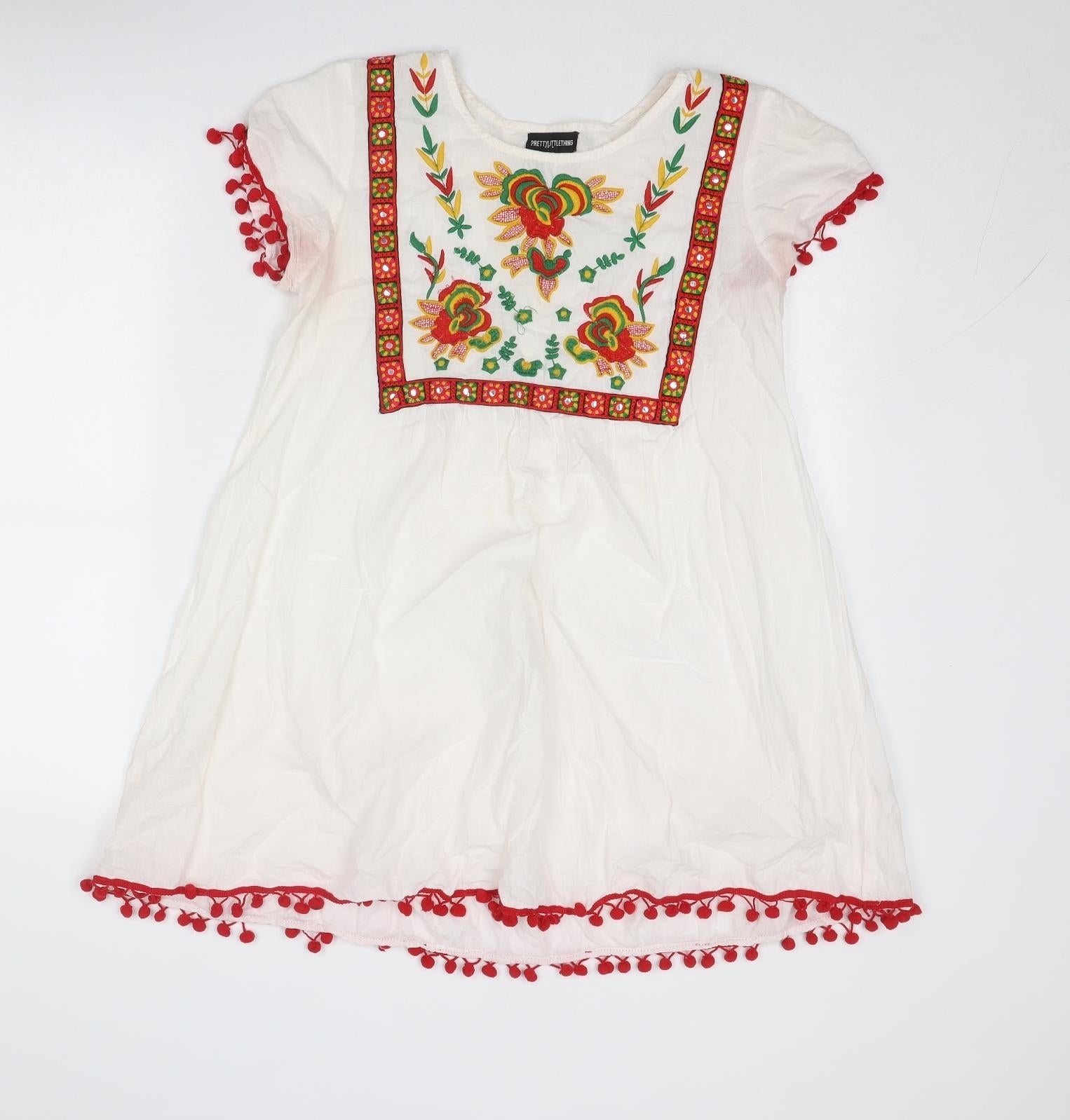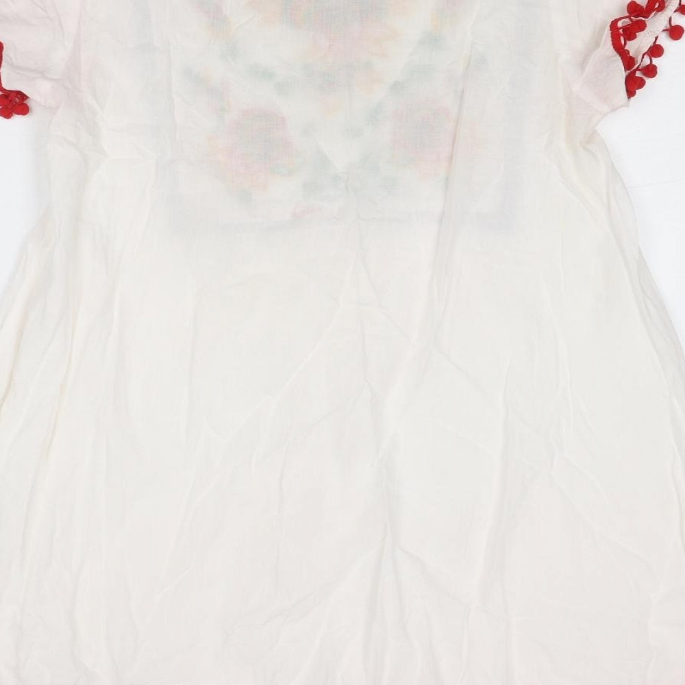 PRETTYLITTLETHING Womens White Floral Cotton A-Line Size 6 Boat Neck Pullover - Pom Pom Trim