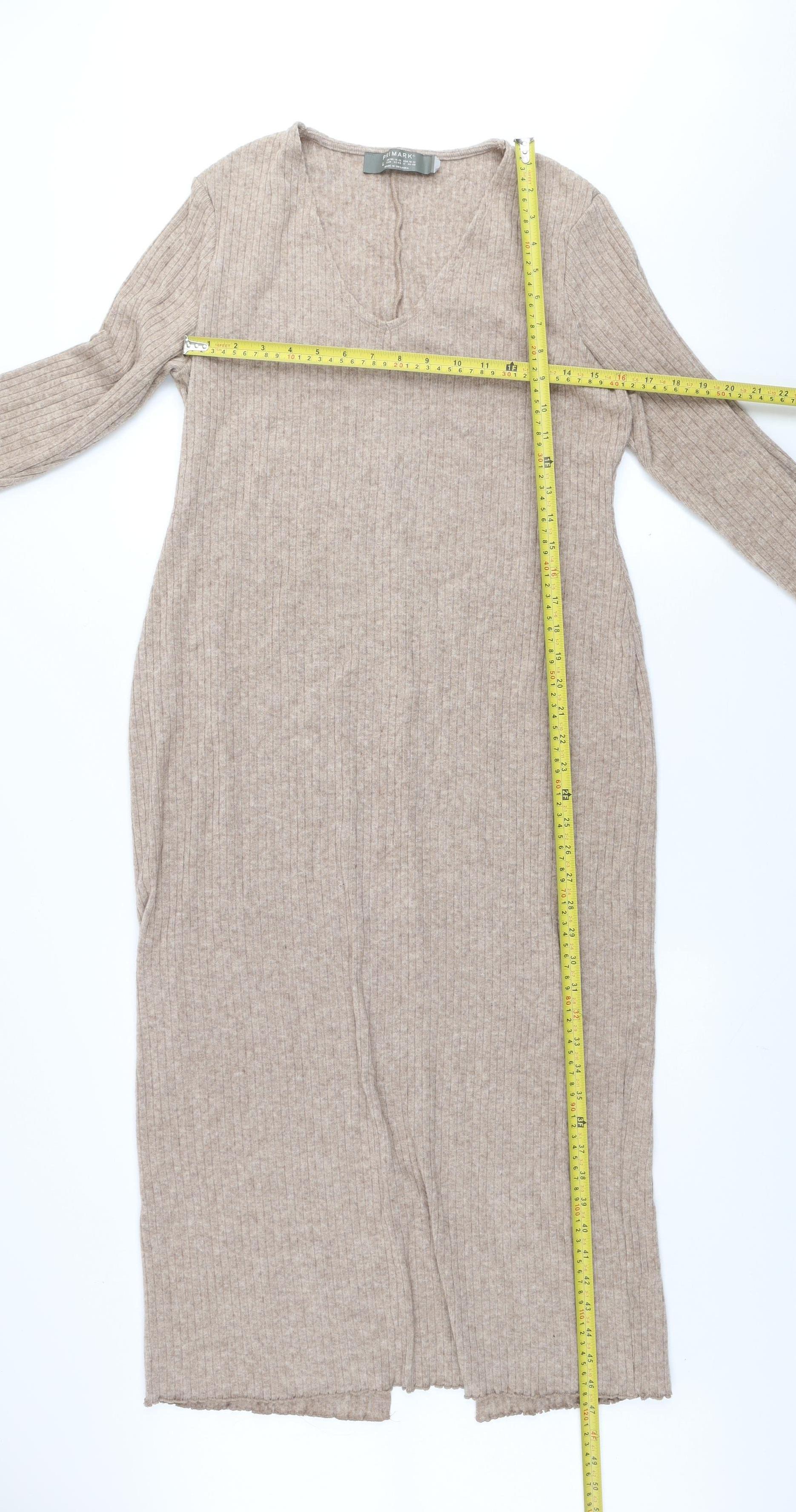 Primark Women Beige Midi Bodycon Knit Dress Size L V-Neck Long Sleeve