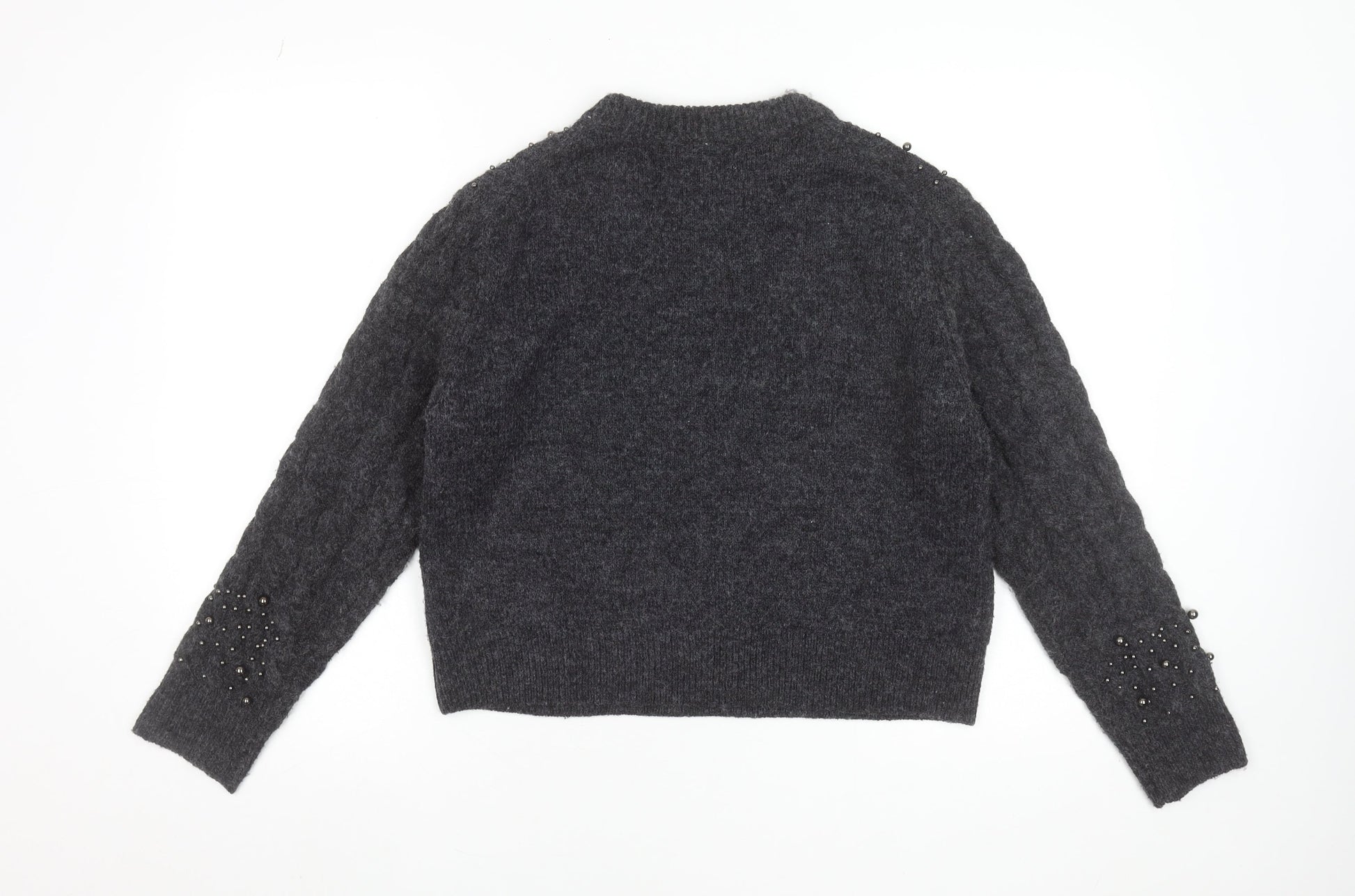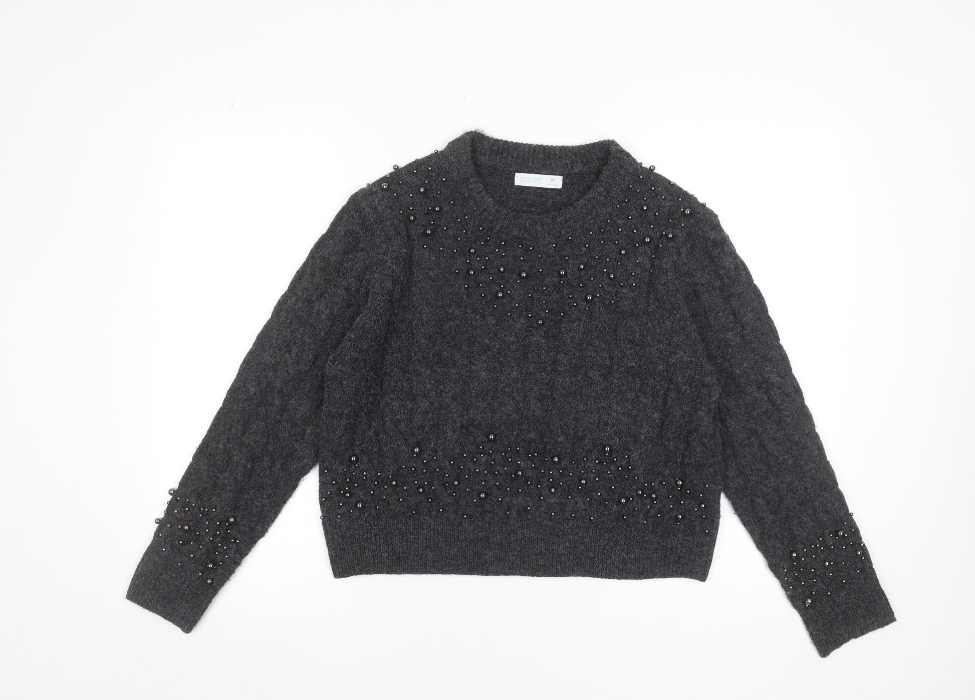 Primark Women Grey Beaded Cable-Knit Crew Neck Jumper Size M