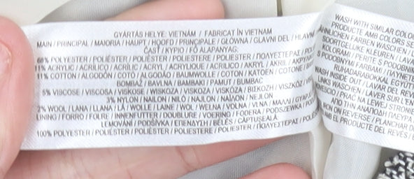 - Material Breakdown: 47% Polyester 31% Acrylic 11% Cotton 5% Viscose 3% Wool 3% Nylon