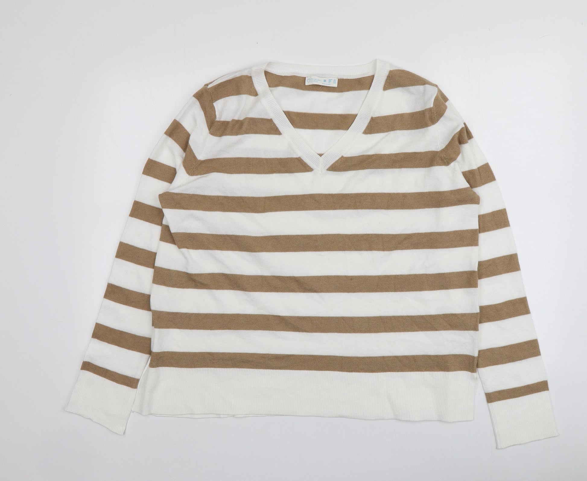 Primark Womens Beige V-Neck Striped Polyester Pullover Jumper Size 12